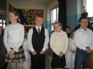 KONKURS NA NAJBARDZIEJ ŚWIĄTECZNY WYSTRÓJ KLASY: 1 miejsce – kl. II 2 miejsce – kl. I, kl. III, kl. VI Pani kierownik prosiła o wystąpienie przedstawicieli klas i przekazała opłatek na ich ręce. Następnie pani Olena Kalemba poczęstowała występujące dzieci cukierkami. Wszyscy rozeszli się do klas na mały poczęstunek przez nich uszykowany. Dzieci i nauczyciele składali sobie życzenia oraz dzielili się opłatkiem.