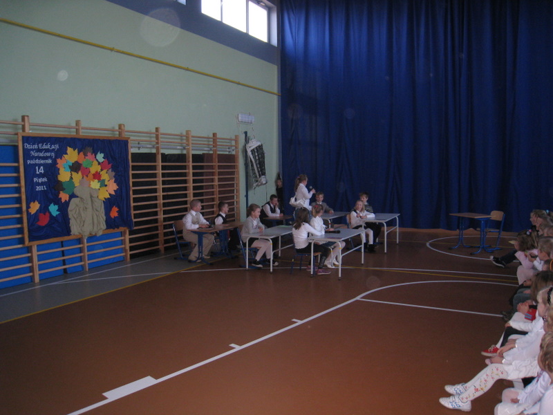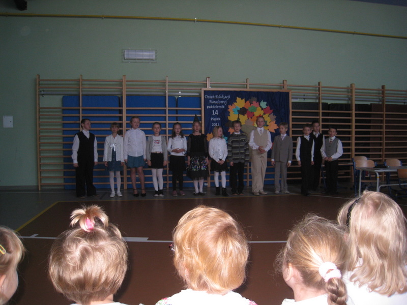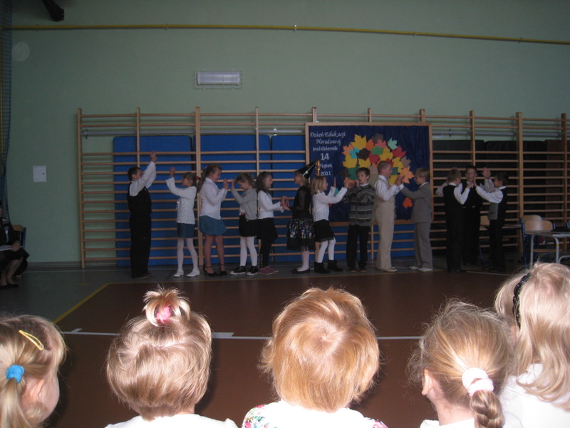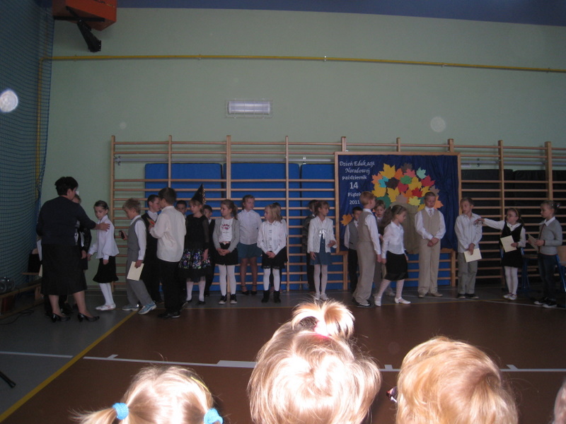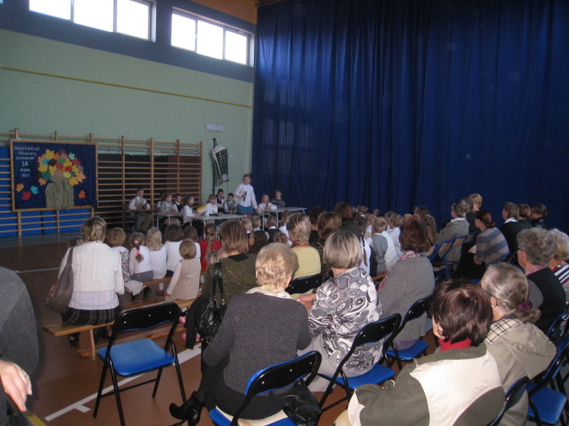 W Dzień Nauczyciela otwieraliśmy plac zabaw. Następnie na sali gimnastycznej przedstawialiśmy scenkę z życia szkoły, śpiewaliśmy piosenki i składaliśmy życzenia naszym paniom i wszystkim pracownikom szkoły. Na uroczystości gościliśmy również byłych pracowników- emerytów, przedstawicieli Rady Rodziców oraz Wójta gminy Kościan. Atmosfera była wspaniała.