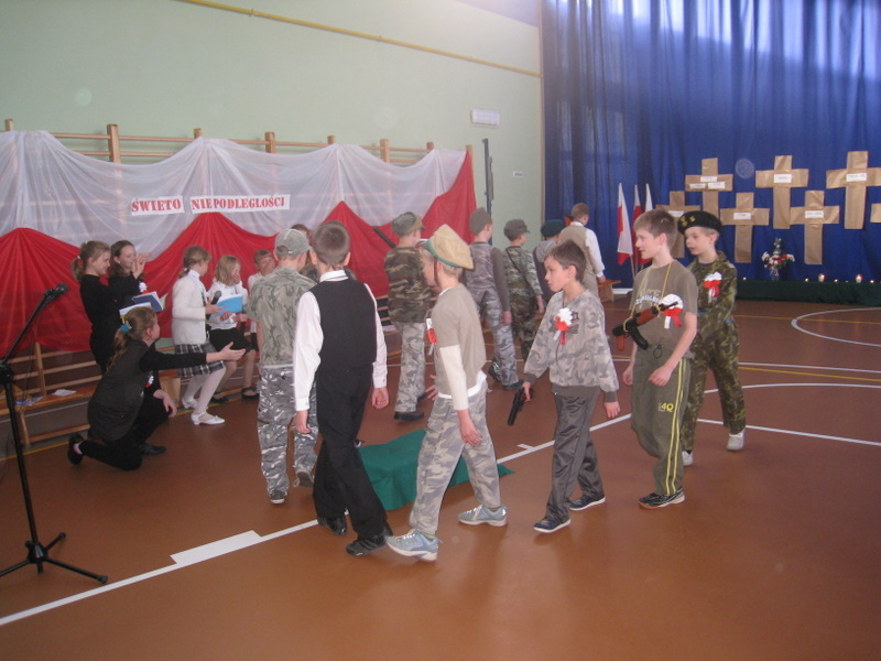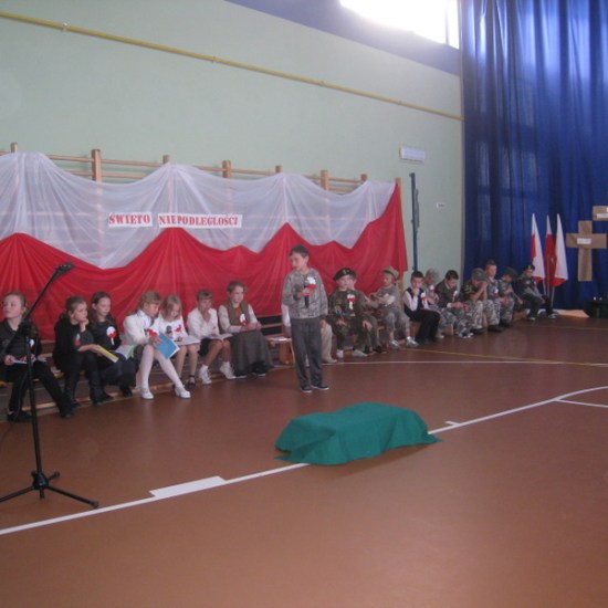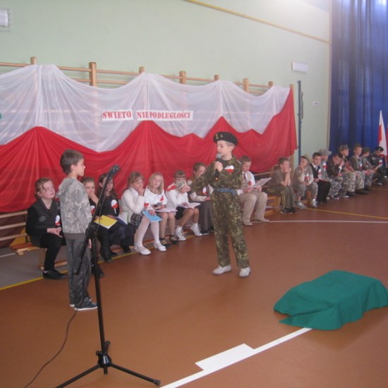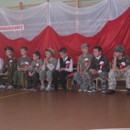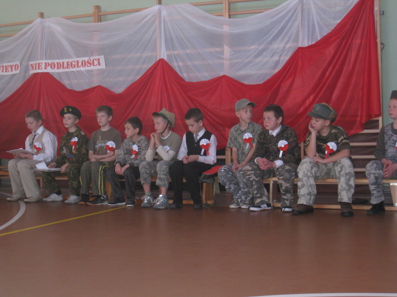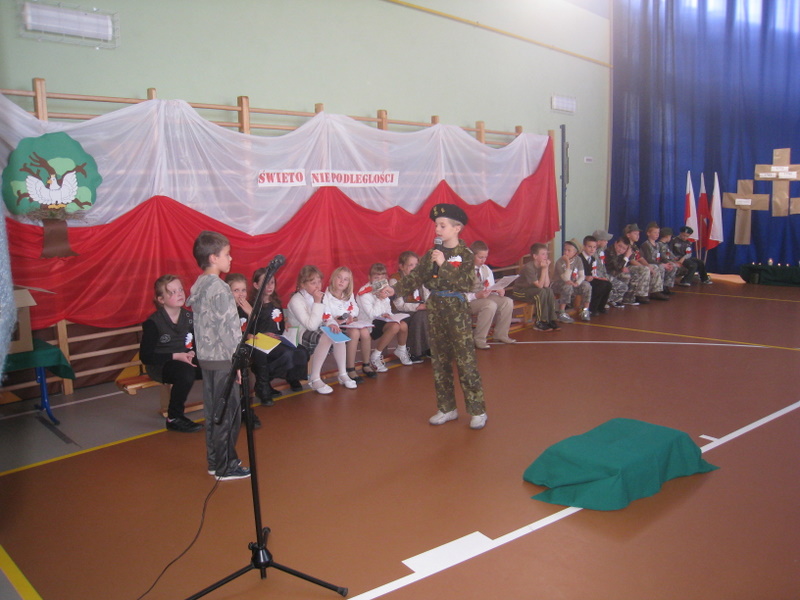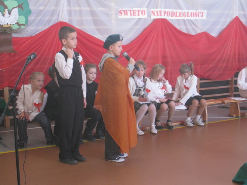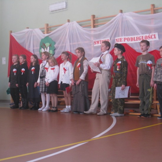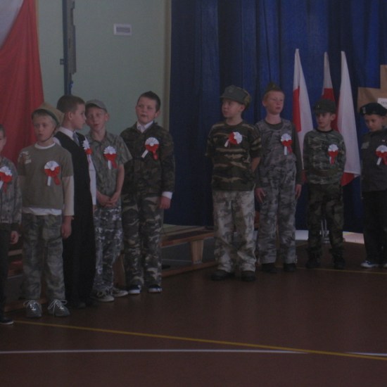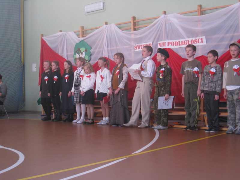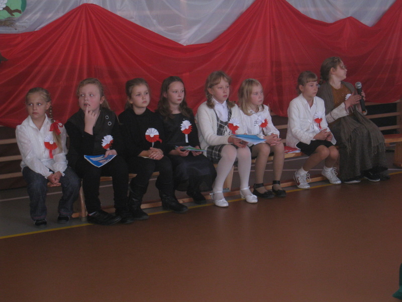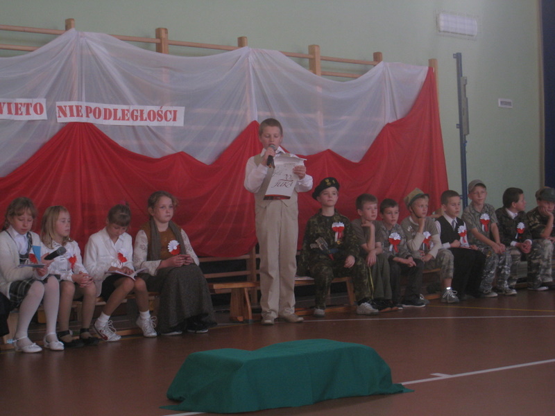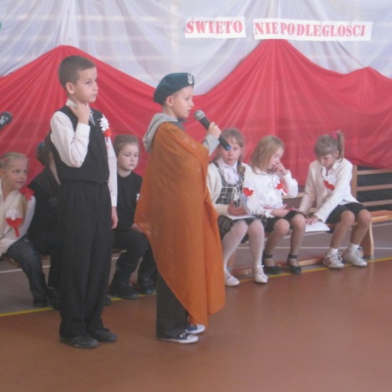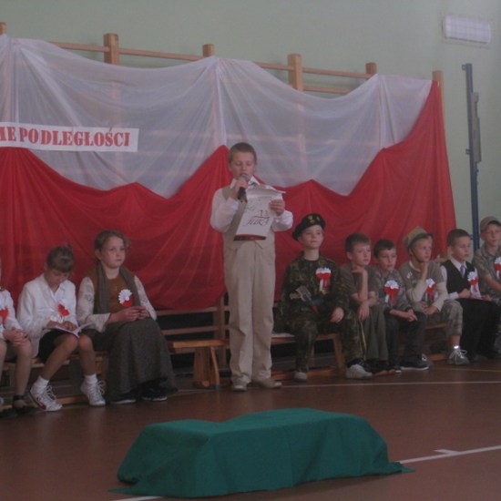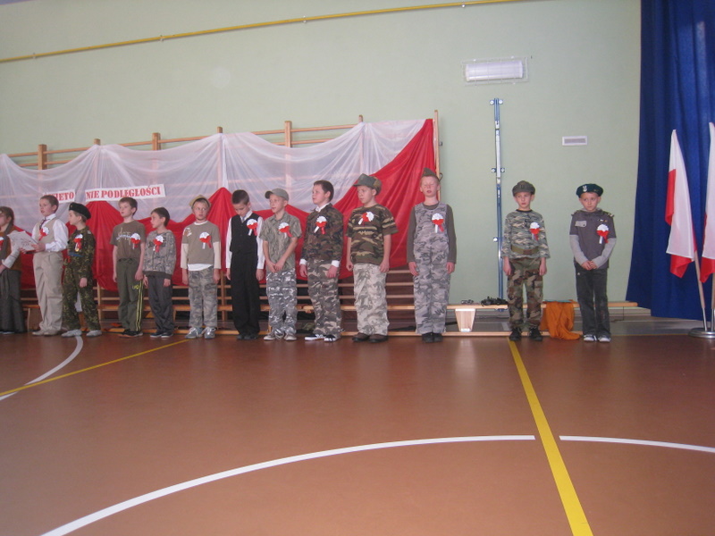 Akademię przygotowali uczniowie klasy trzeciej oraz dzieci z kółka regionalnego z klasy drugiej do scenariusza p. Krystyny Nowak. Klasę pierwszą reprezentowała Wioletka Kabacińska. Dzieci m.in. mówiły teksty Marii Konopnickiej, Edwarda Słońskiego, Konstantego Gaszyńskiego, Artura Oppmana. W programie oprócz znanych pieśni patriotycznych wykorzystano utwory Bułata Okudżawy, Zbigniewa Raja i Jana Pietrzaka, Jarosława Piątkowskiego, Chopina. Pomimo trudnej tematyki, jak i repertuaru mali artyści doskonale czuli swoje role i wspaniale sobie poradzili!