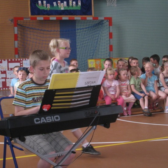 Mieliśmy też możliwość posłuchać, jak grają nasi koledzy (Paulina Oleszczuk, Nikola Woźniak, Kacper Nawrocki) na keybordach. Zagrali wspaniale! Ola Kozak, Zuzia Wadowiec i Marta Bajsztok zatańczyły taniec hip-hopowy. A na koniec występów mogliśmy podziwiać naszych rodziców: najpierw tatusiów, potem mamusie, jak wdzięcznie poruszali się na scenie w rytm znanych melodii. Na jednej ze ścian sali rozwieszone były nasze prace plastyczne i dyplomy za różne osiągnięcia.