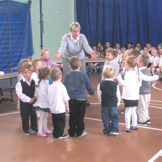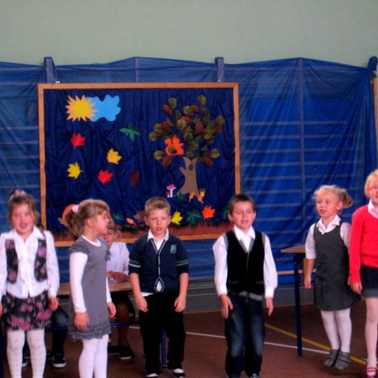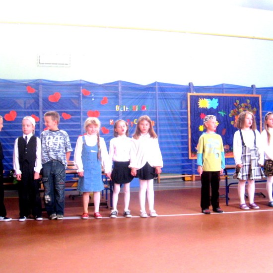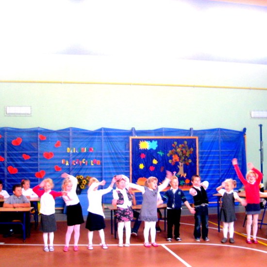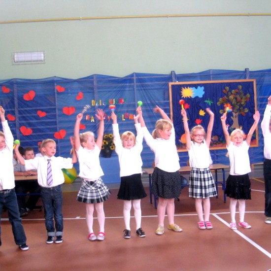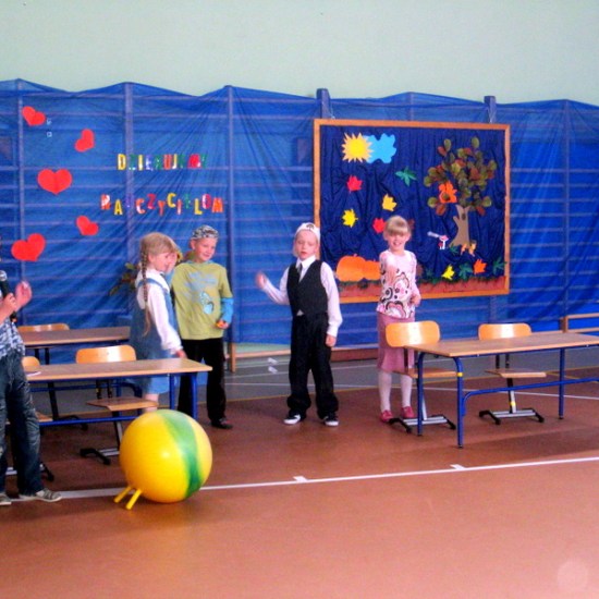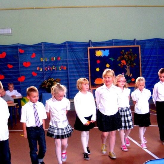 Przedstawialiśmy scenki z życia szkoły, śpiewaliśmy piosenki, tańczyliśmy. Na koniec razem z naszymi rodzicami złożyliśmy życzenia i przy akompaniamencie piosenki „Wszystkiego najlepszego”wręczyliśmy naszym gościom i nauczycielom kwiaty.