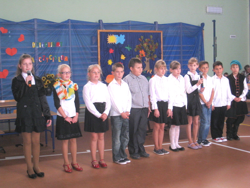 Przedstawialiśmy scenki z życia szkoły, śpiewaliśmy piosenki, tańczyliśmy. Na koniec razem z naszymi rodzicami złożyliśmy życzenia i przy akompaniamencie piosenki „Wszystkiego najlepszego”wręczyliśmy naszym gościom i nauczycielom kwiaty.