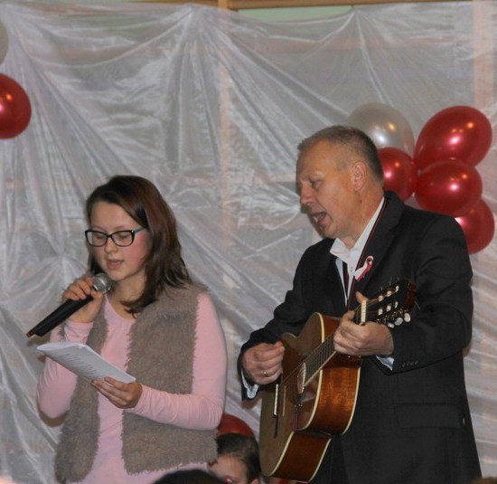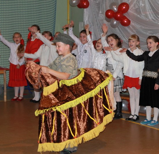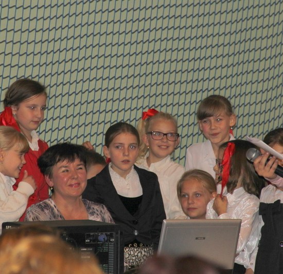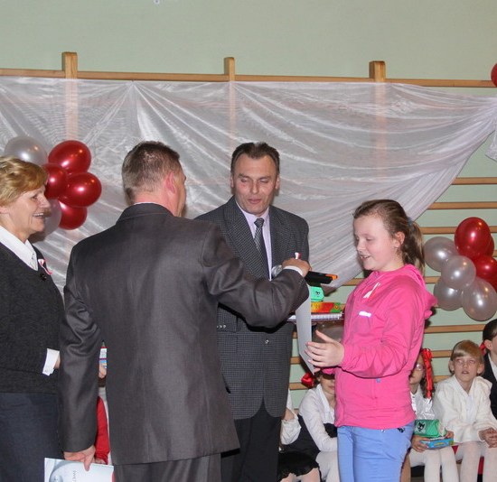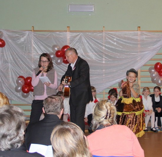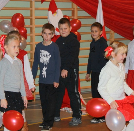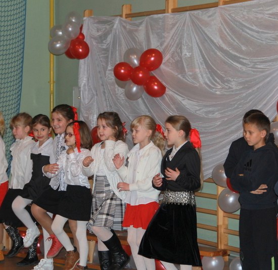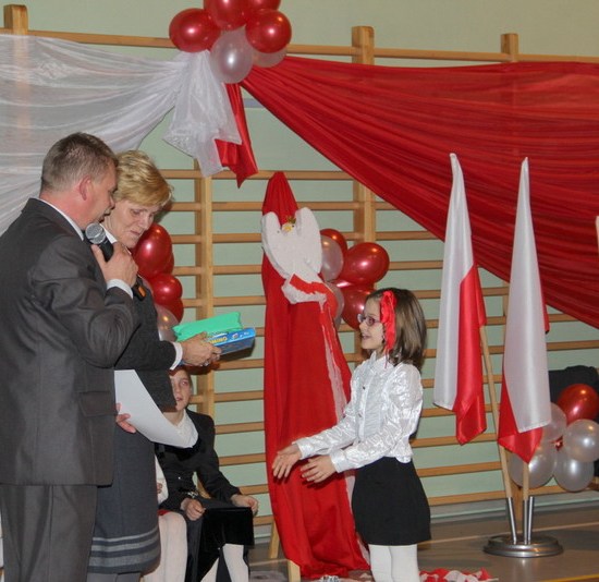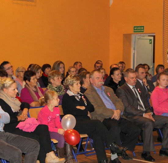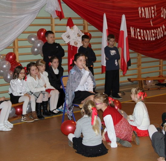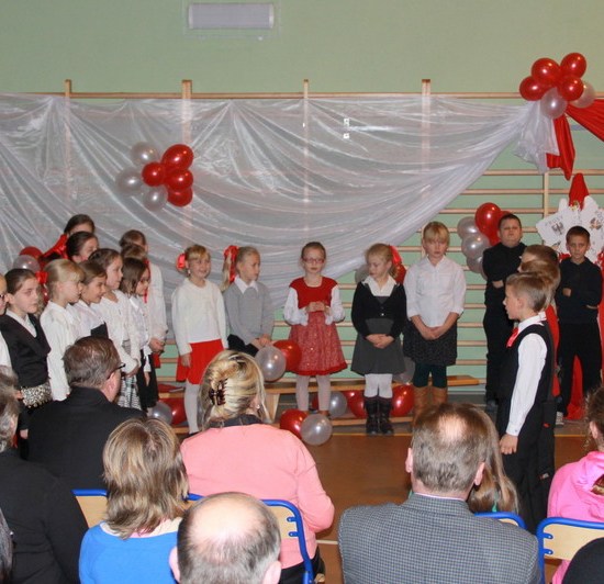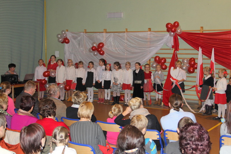 Przybyli na wieczornicę goście otrzymali biało-czerwone wstążki, a występujący i dzieci baloniki w barwach narodowych. Wieczornica rozpoczęła się o 17. Składała się z trzech części. Pierwsza część to występy dzieci. Podczas występów uczniowie zaprezentowali wiersze K. Iłłakowiczówny, J. Kostry, J. Mączki, Cz. Miłosza, E. Słońskiego, L. Staffa, Wł. Bełzy i piosenki patriotyczne: m.in. Niepodległość, Legiony, Pierwsza kadrowa, Jedzie, jedzie na kasztance, Przybyli ułani… Tłem inscenizacji była muzyka Bartosza Chajdeckiego.