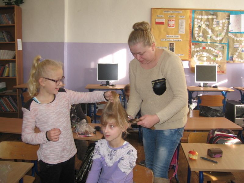 Niedawno na zajęciach gościliśmy panią Kabacinską – mamę Wioletki, która wprowadziła uczniów w świat dziergania i szydełkowania, a dzisiaj pani Kozak (mama Oli), pochwaliła się swoimi umiejętnościami fryzjerskimi. W czasie rozmowy dowiedzieliśmy się, że p. Kozak od najmłodszych lat lubiła czesać i wymyślać różne fryzury, chciała iść do szkoły fryzjerskiej. Jednak jej życiowe losy potoczyły się inaczej, nie poszła do wymarzonej szkoły, ale nadal chętnie wymyśla piękne uczesania (widzimy je codziennie u Oli).