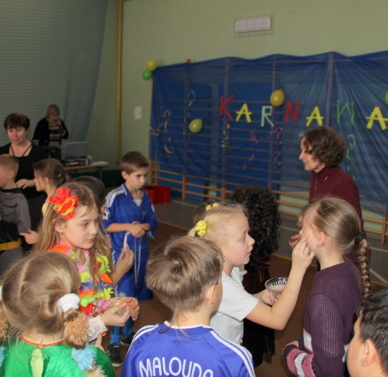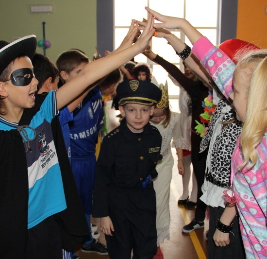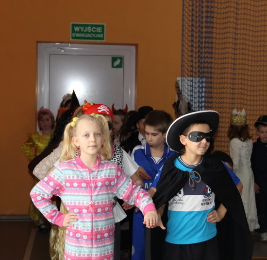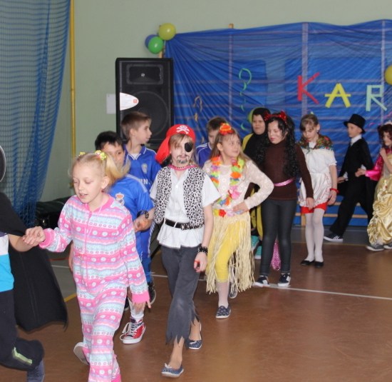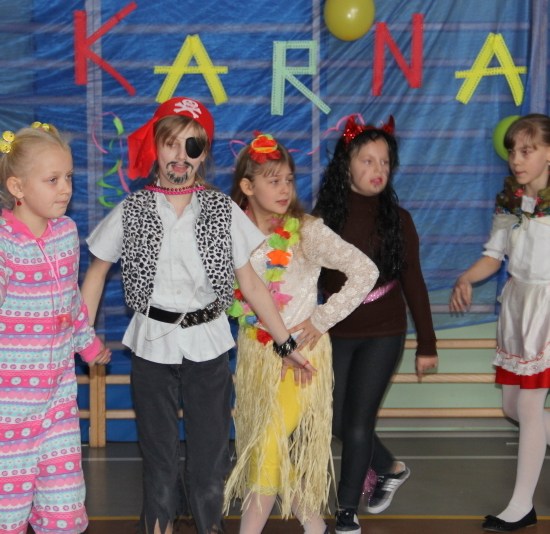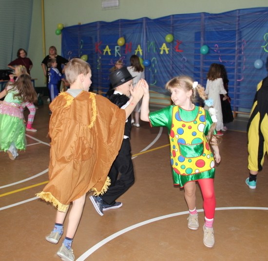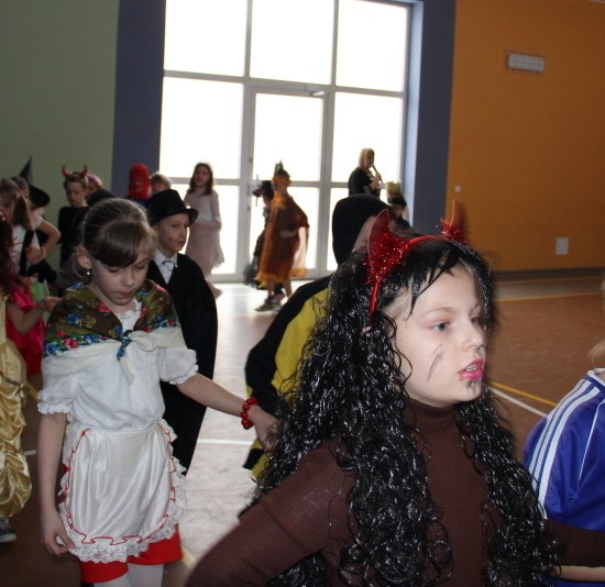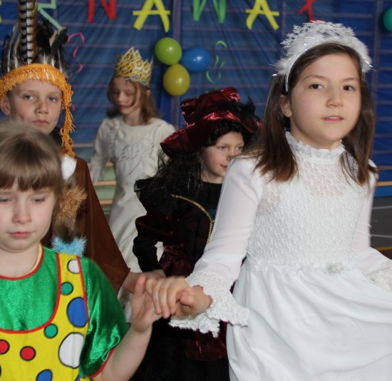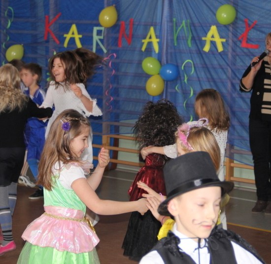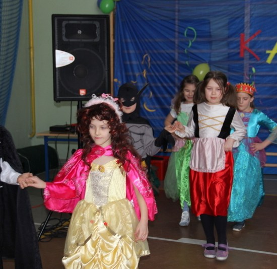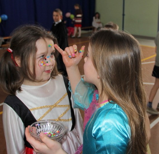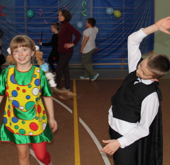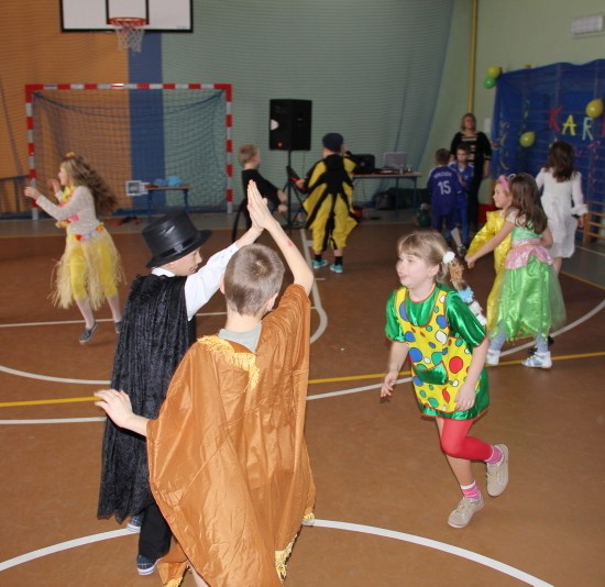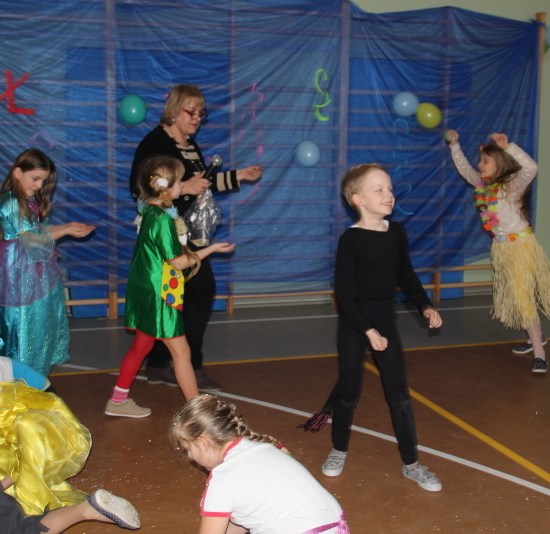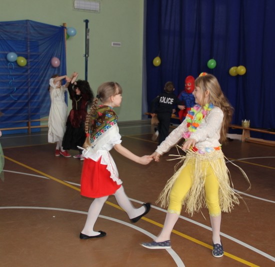 Jak co roku, spotkaliśmy się na sali sportowej, tyle, że trudno nam się było rozpoznać. Każdy pięknie przebrany. Prawdziwy bal przebierańców! Nie zabrakło radosnej zabawy, dobrej muzyki i oczywiście wspaniałych wypieków naszych mam. Bal rozpoczęliśmy polonezem, a potem już się potoczyło… Były też fajne konkursy, np. kto nalepi koledze więcej piegów z confetti, taniec w parach, trójkach, szóstkach… itp.