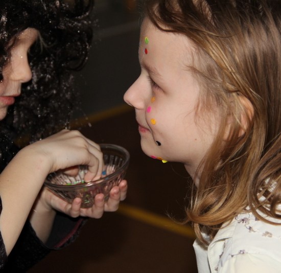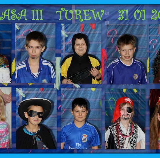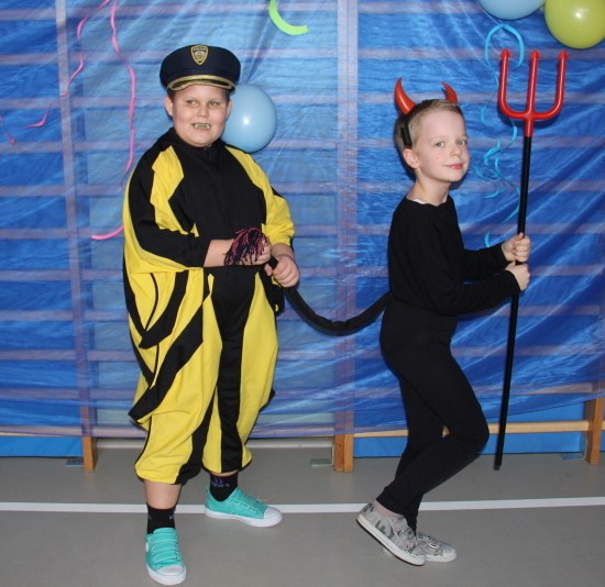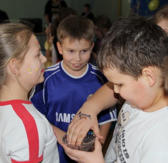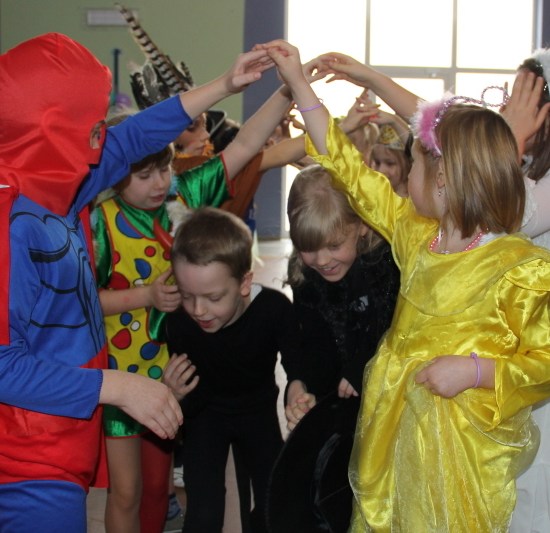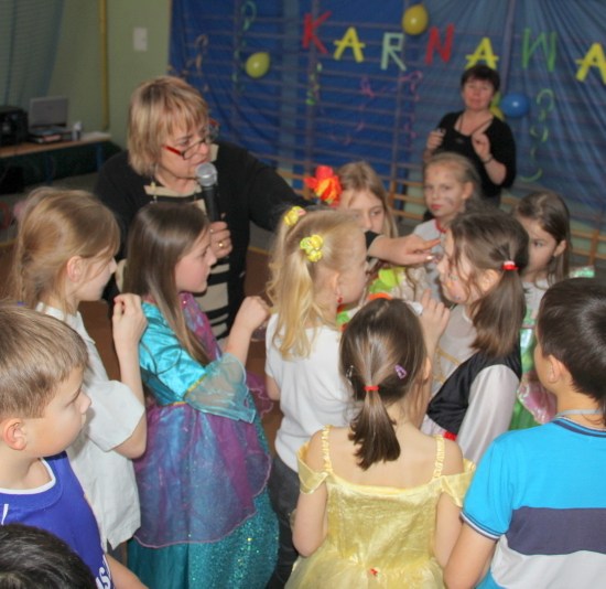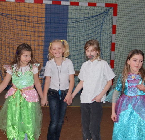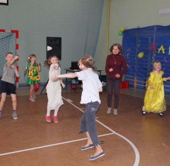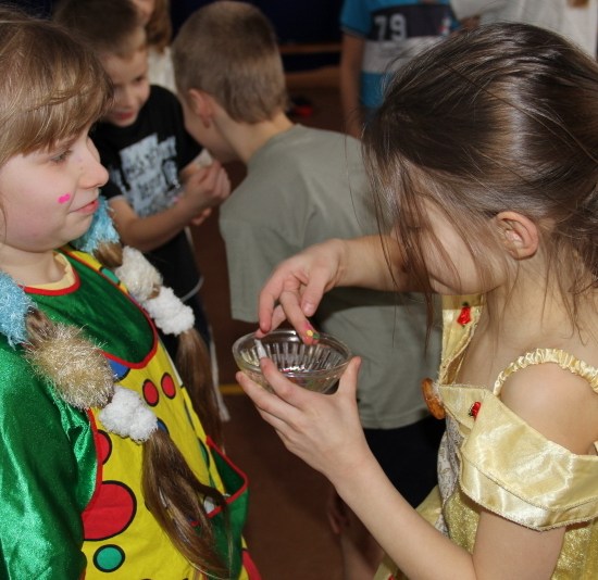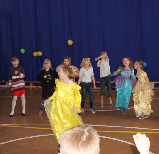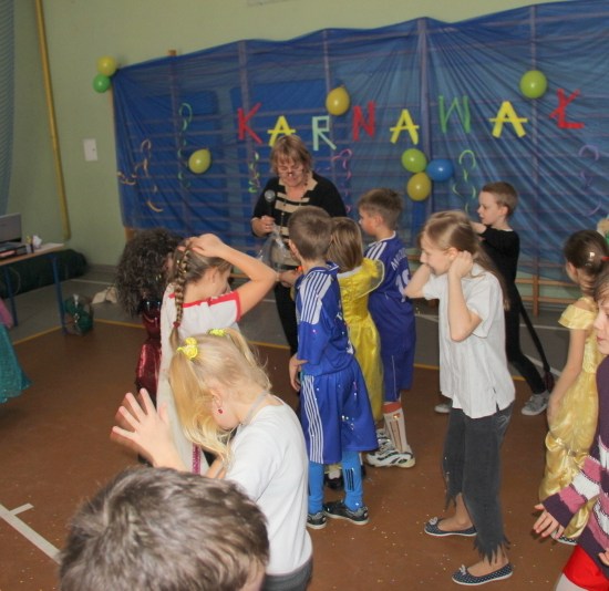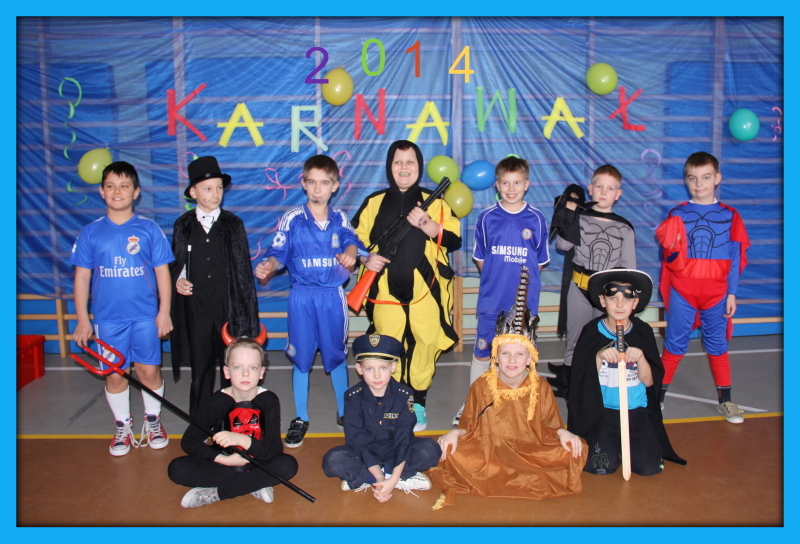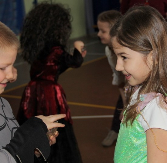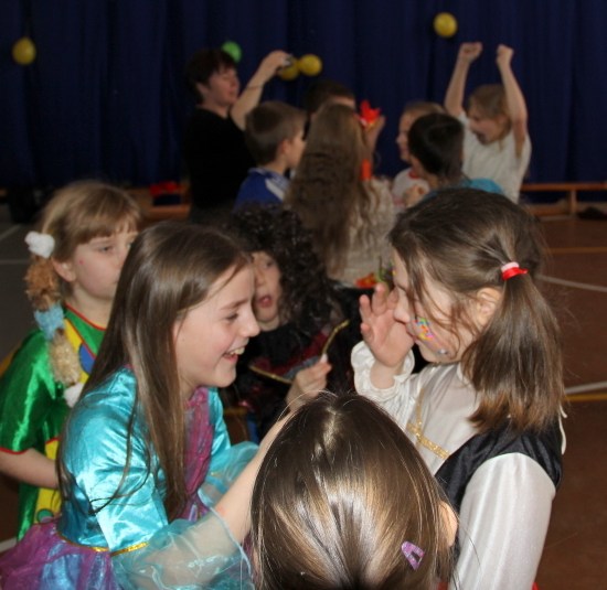 Jak co roku, spotkaliśmy się na sali sportowej, tyle, że trudno nam się było rozpoznać. Każdy pięknie przebrany. Prawdziwy bal przebierańców! Nie zabrakło radosnej zabawy, dobrej muzyki i oczywiście wspaniałych wypieków naszych mam. Bal rozpoczęliśmy polonezem, a potem już się potoczyło… Były też fajne konkursy, np. kto nalepi koledze więcej piegów z confetti, taniec w parach, trójkach, szóstkach… itp.