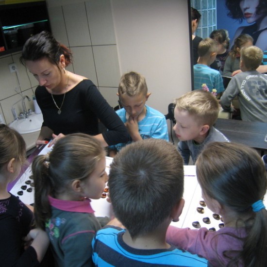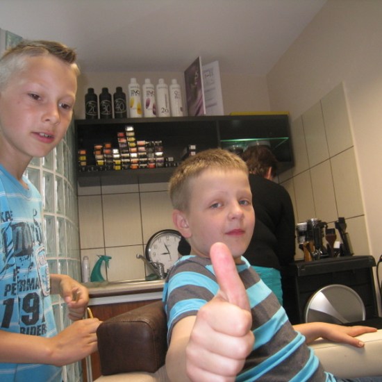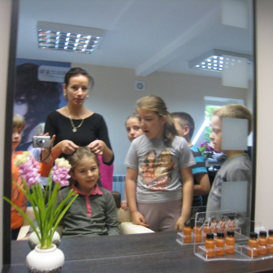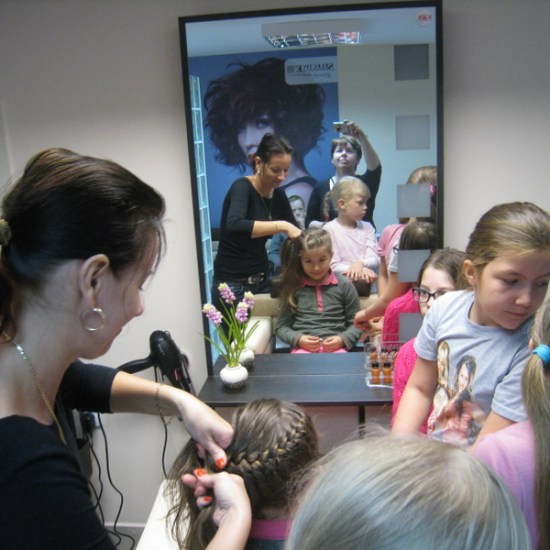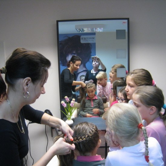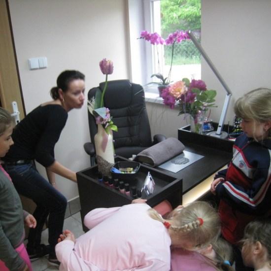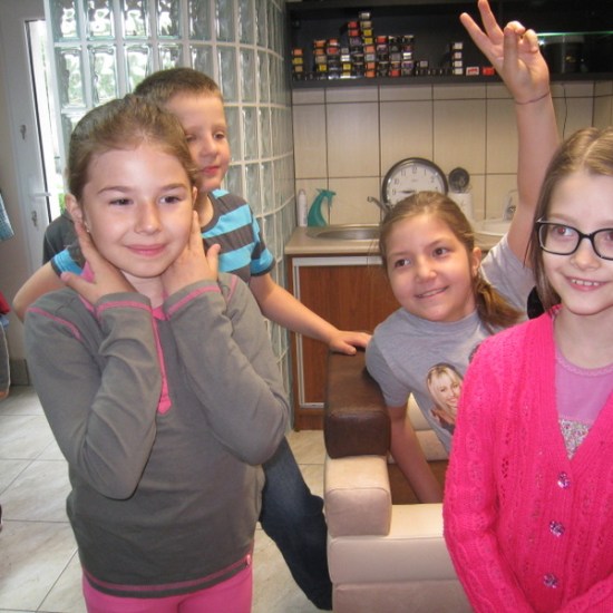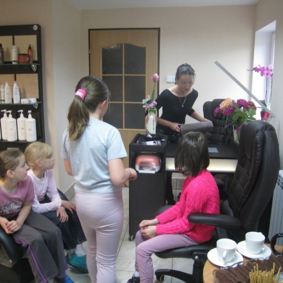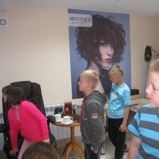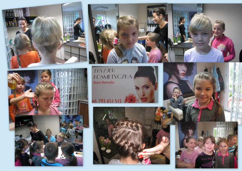 Pani Hania (mama Kacperka) przywitała nas własnym wyśmienitym wypiekiem oraz sokiem. Z zainteresowaniem obejrzeliśmy całe wyposażenie zakładu: farby, lakiery, szampony, akcesoria do modelowania fryzur i pielęgnacji paznokci. Najważniejszym jednak wydarzeniem dla kilku szczęśliwych modelek było zajęcie miejsca w fotelu i oddanie się sprawnym rękom pani Hani. Dumne dziewczynki jedna po drugiej wstawały z fotela odmienione poprzez nowe fajne fryzury.