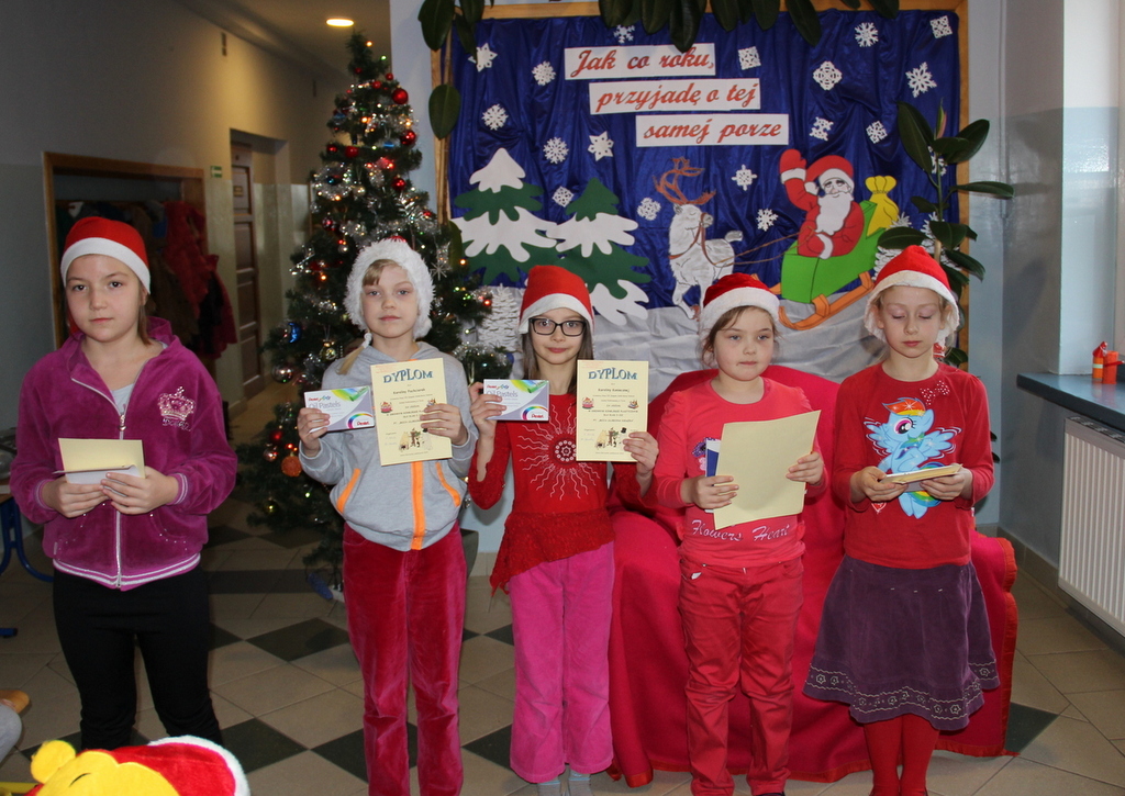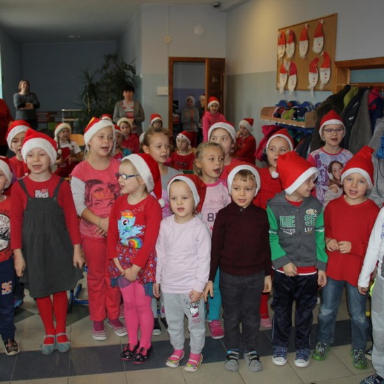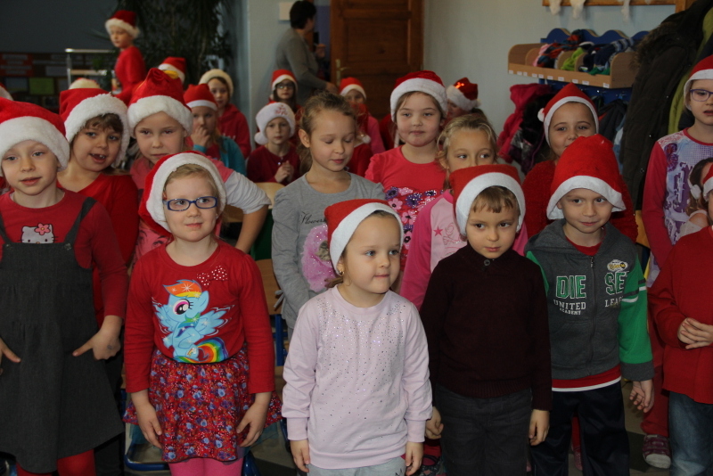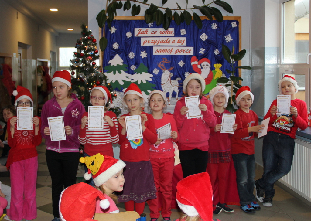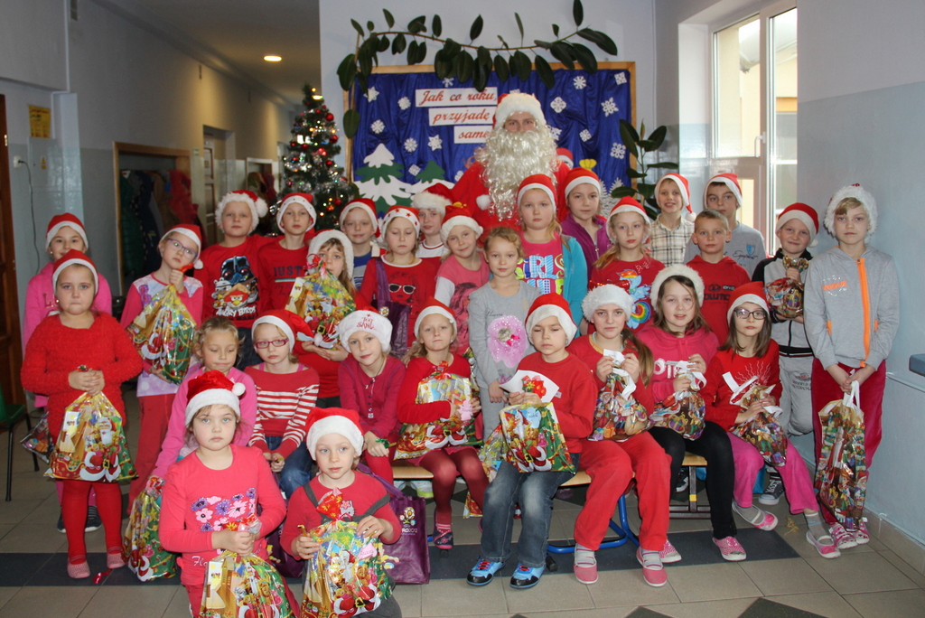 Tego dnia większość z nas przyszła do szkoły ubrana na czerwono i w mikołajkowych czapeczkach. Zebraliśmy się wszyscy na korytarzu czekając niecierpliwie na niezwykłego gościa. Pani kierownik w imieniu samorządu podziękowała tym uczniom, którzy włączyli się w akcję pomocy psom w schronisku. Dzieci te otrzymały podziękowanie z kolorowanką – sylwetkę psa.