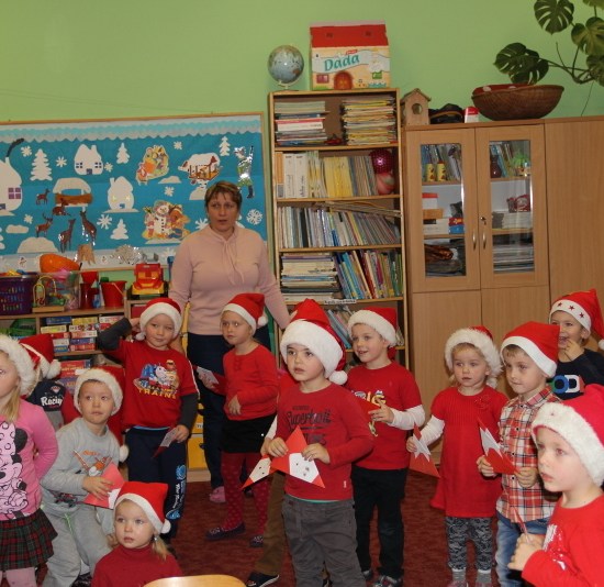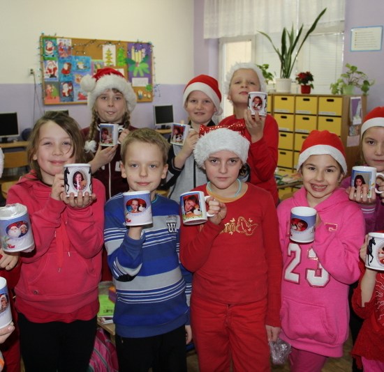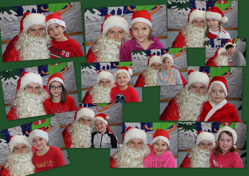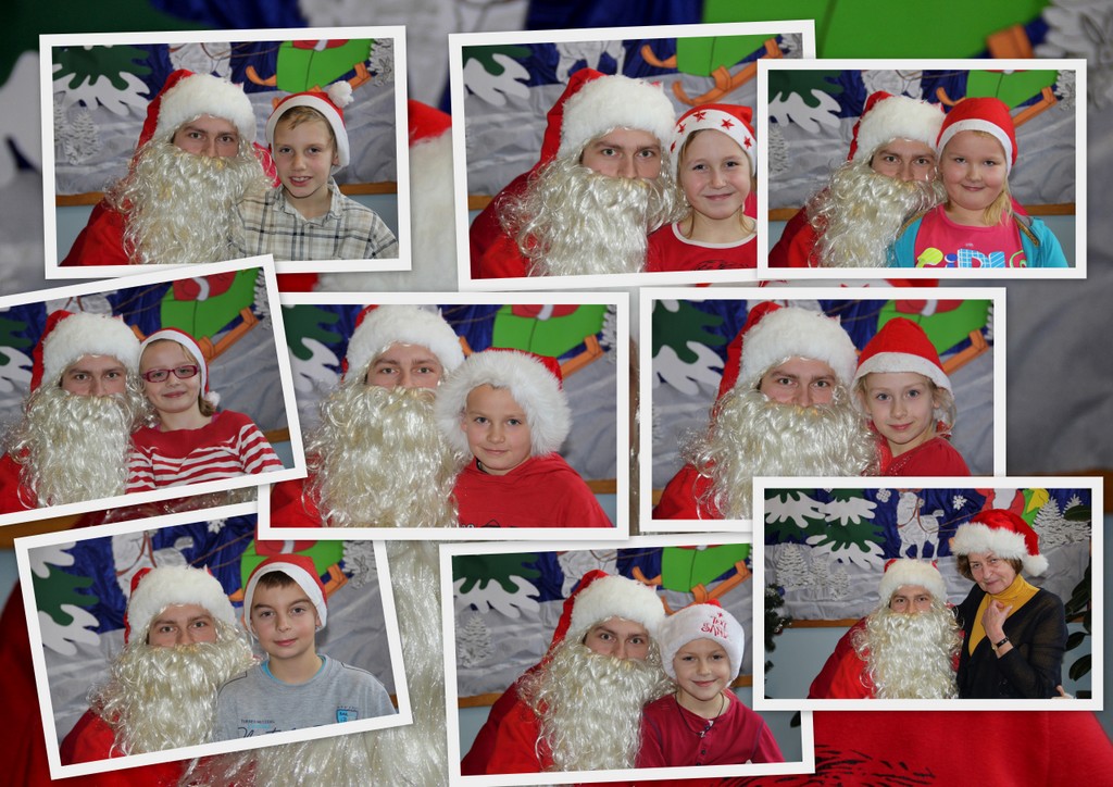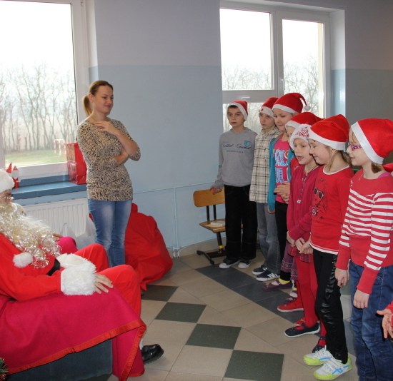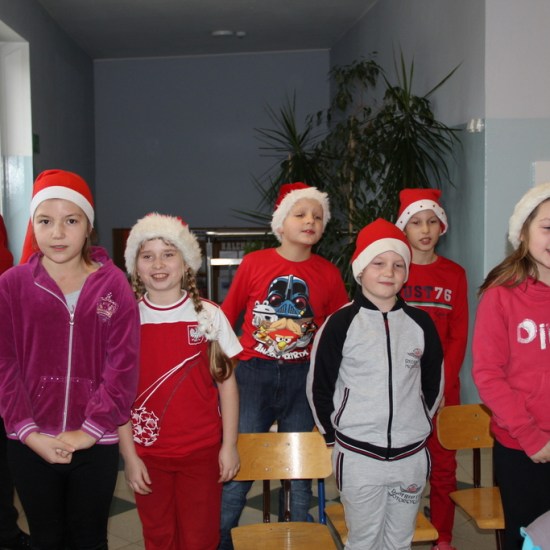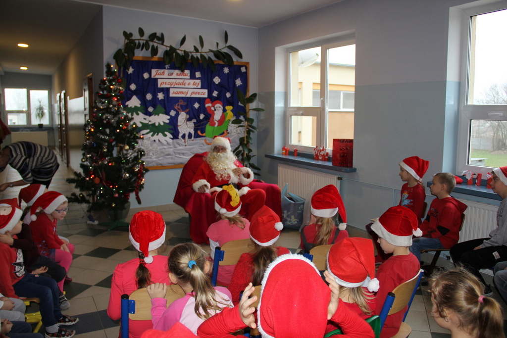 Tego dnia większość z nas przyszła do szkoły ubrana na czerwono i w mikołajkowych czapeczkach. Zebraliśmy się wszyscy na korytarzu czekając niecierpliwie na niezwykłego gościa. Pani kierownik w imieniu samorządu podziękowała tym uczniom, którzy włączyli się w akcję pomocy psom w schronisku. Dzieci te otrzymały podziękowanie z kolorowanką – sylwetkę psa.