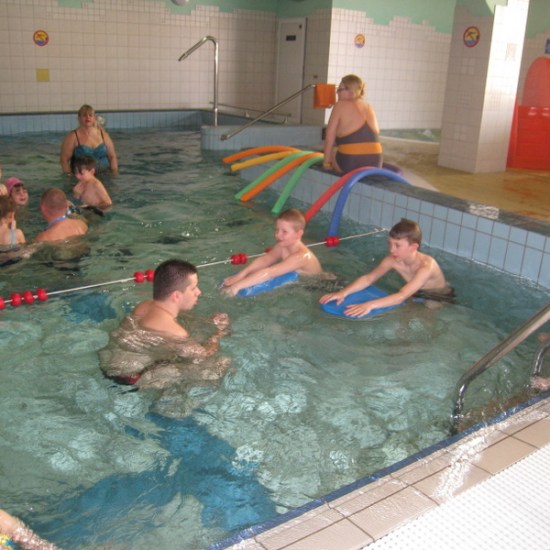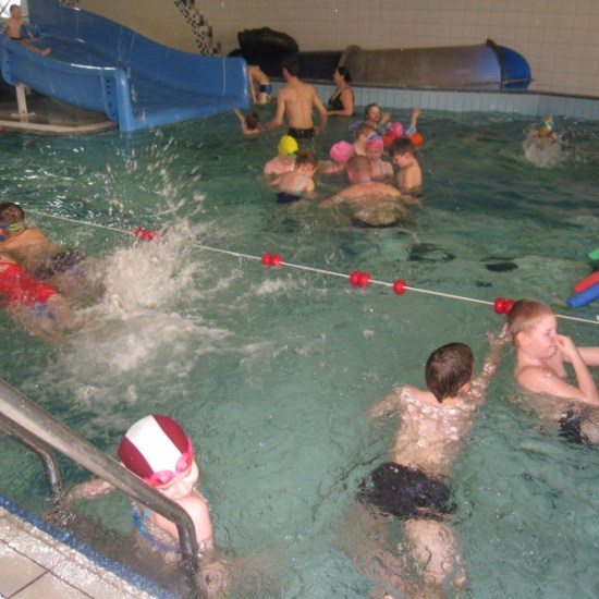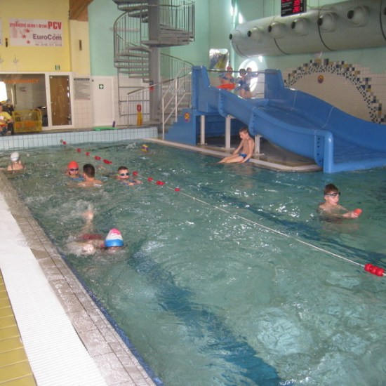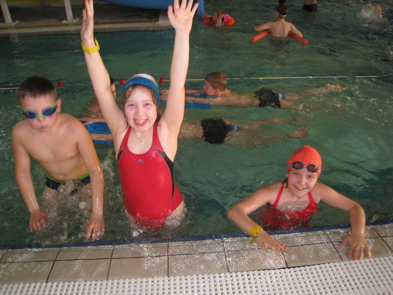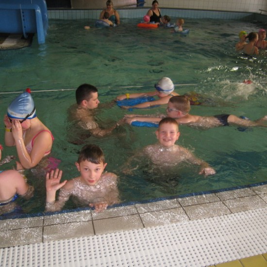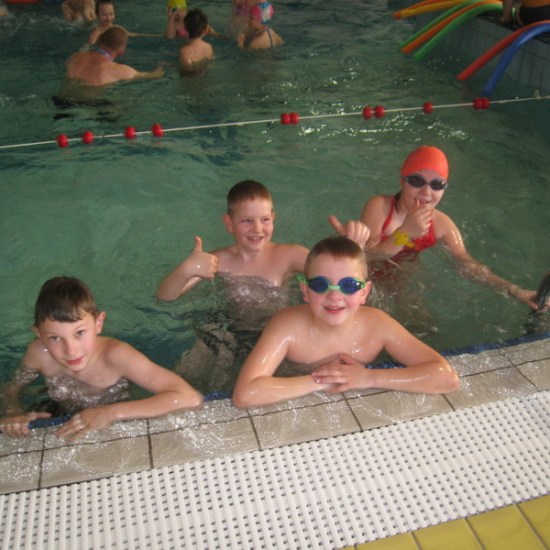 W każda środę klasy I, II i III jeżdżą do Kościana na basen. Uczniowie klasy pierwszej i drugiej bawią się w małym basenie i zjeżdżają z małej zjeżdżalni. Uczniowie klasy trzeciej uczą się pływać z pomocą pana ratownika. Pan pokazuje jak prawidłowo pływać, a dzieci naśladują jego ruchy. Przychodzi też czas na skoki do dużego basenu. Wszyscy chętnie i odważnie oddają swoje skoki. Po wyczerpującej nauce pływania z ratownikiem jest również chwila na zabawy z innymi dziećmi oraz na zjazdy z dużej zjeżdżalni. Po dwóch godzinach spędzonych w wodzie udajemy się do szatni. Ubieramy się, a dziewczynki suszą swoje długie piękne włosy. Zmęczone dzieci siadają przy stolikach w kawiarence i jedzą śniadanie. Pełni uśmiechu radośni wracamy do Turwi, wiedząc, że za tydzień znów tu wrócimy.
