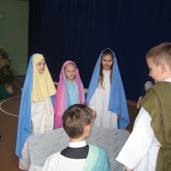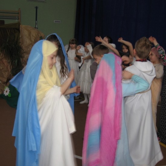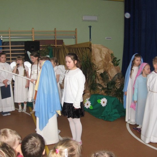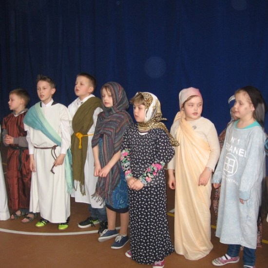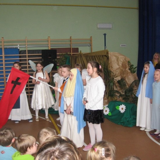 27 marca z okazji zbliżających się świąt wielkanocnych w naszej szkole odbyło się przedstawienie misterium wielkanocnego o śmierci i zmartwychwstaniu Pana Jezusa. Przedstawienie przygotowały dzieci uczestniczące w zajęciach kółka muzycznego pod kierunkiem pani Oleny Kalemby. Sceny misterium toczyły się w scenografii grobu Pańskiego, który wspólnie z panią Oleną przygotowała pani Jola Krawczyk. Przedstawienie wielkanocne miały także okazję obejrzeć dzieci z oddziału przedszkolnego i zerowego, a także przybyli rodzice, a nawet babcie. Uczniowie pięknie prezentowali się w swoich strojach, wykazali się dużym kunsztem aktorskim i wokalnym, za co zostali nagrodzenie gromkimi brawami. Na zakończenie apelu pani kierownik Krystyna Nowak, podziękowała dzieciom i ich opiekunowi za przygotowanie apelu i złożyła wszystkim świąteczne życzenie.