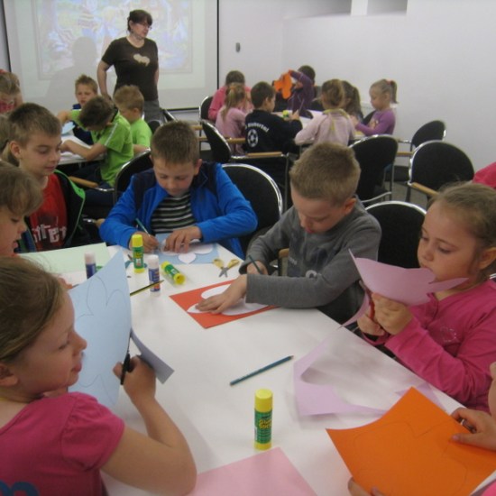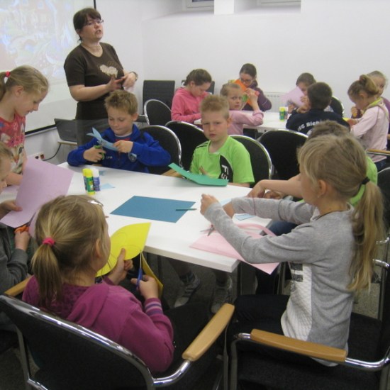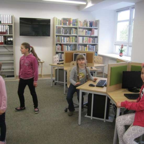 6 maja przy okazji wyjazdu na basen, zerówka zwiedziła dworzec PKP, a my z klasą pierwszą i drugą udaliśmy się na wycieczkę do odnowionej biblioteki w Kościanie. Pani bibliotekarka oprowadziła nas po nowych pomieszczeniach takich jak: czytelnia dla dorosłych, wypożyczalnie, sale zajęć. Przedtem obejrzeliśmy prezentację multimedialną o Emilii Waśniowskiej poznańskiej nieżyjącej już poetce. Robiliśmy jamniki z papieru. Było fajnie, bo jechaliśmy windą.