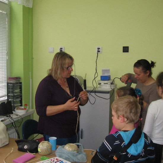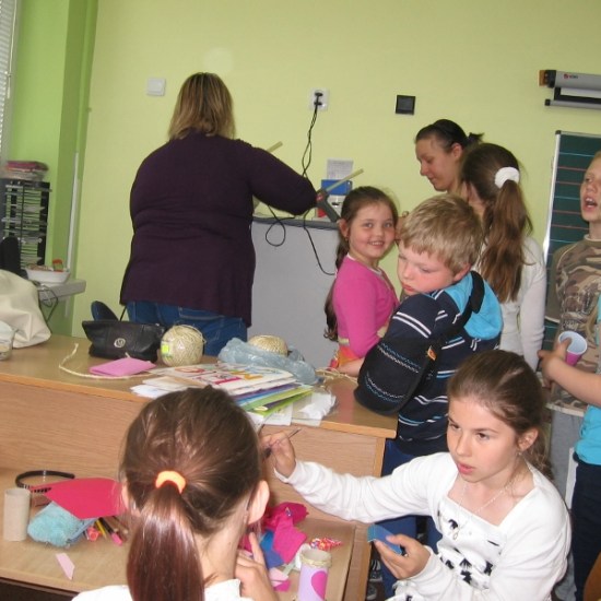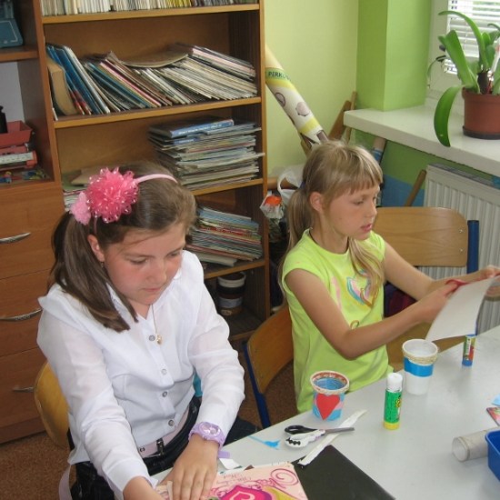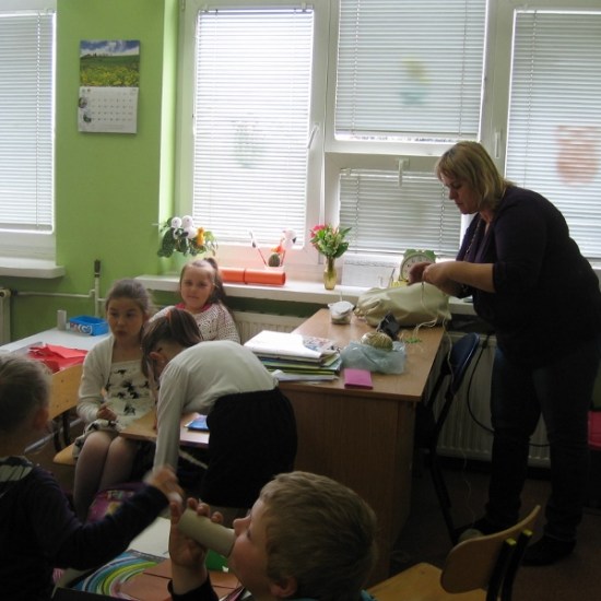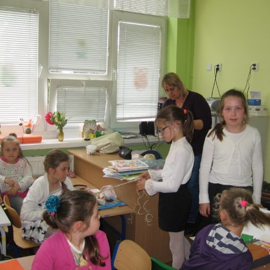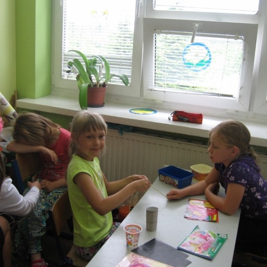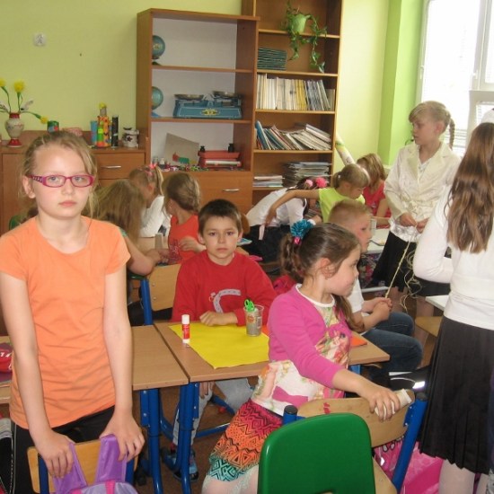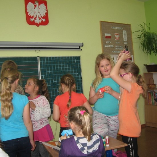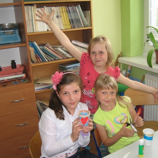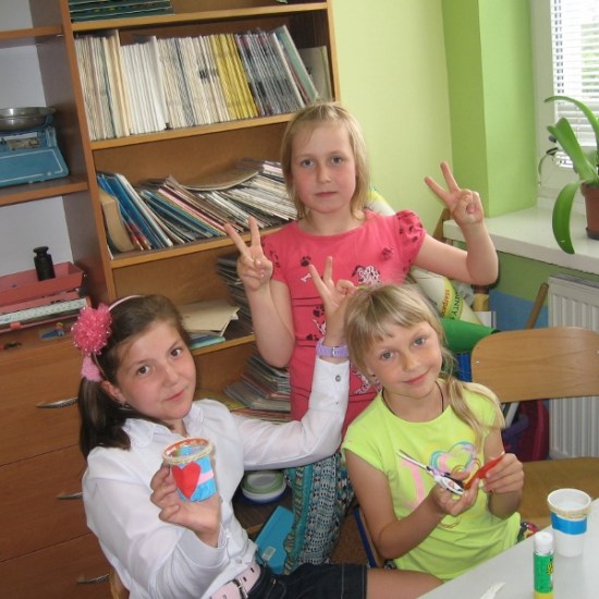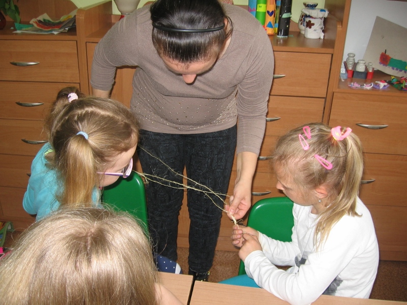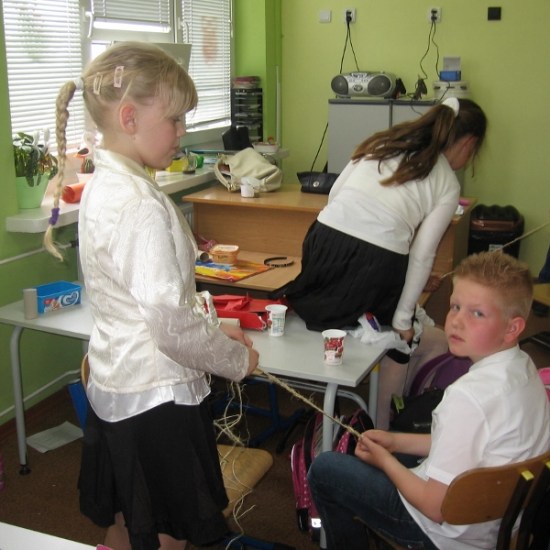 Na wszystkie zajęciach kółka plastycznego, uczniowie czekają z niecierpliwością. Wiedzą, że znowu coś ciekawego będzie się działo. Przez cały rok dzieci poznały różnorodne dziedziny sztuk plastycznych, wykonały wiele prac, którymi przyozdobiliśmy klasy, korytarz i świetlicę. Podczas zajęć dzieci wykonywały prace na konkursy, czerpiąc inspiracje z poznanych technik. Na jedno z ostatnich spotkań zaprosiliśmy mamę Sandry i Weroniki, panią Anię Jędroszkowiak. Mogliśmy podziwiać jej prace już wcześniej. Pani Ania wykonuje pomysłowe prace ze sznurka ( piękne szkatułki, pudełka, koszyczki). Podczas zajęć pokazała dzieciom, na czym polega ta technika. Najpierw trzeba było zapleść ze sznurków warkocze (nie było to takie proste). Następnie owija się tymi warkoczykami wybrany przedmiot, przyklejając sznurek klejem na gorąco ( tu już musiały wkroczyć do akcji panie). Postanowiliśmy wykorzystać tę technikę, żeby zrobić prezenty dla mam wazoniki z okazji Dnia Matki. Do tej pracy dzieci użyły plastikowych kubeczków po lodach i jogurtach, pięknie ozdobiły je kolorowym papierem i wykończyły otoczką ze sznurka. Do środka włożyły kwiatki, wykonane na wcześniejszych zajęciach. Mamy będą zachwycone takim prezentem.