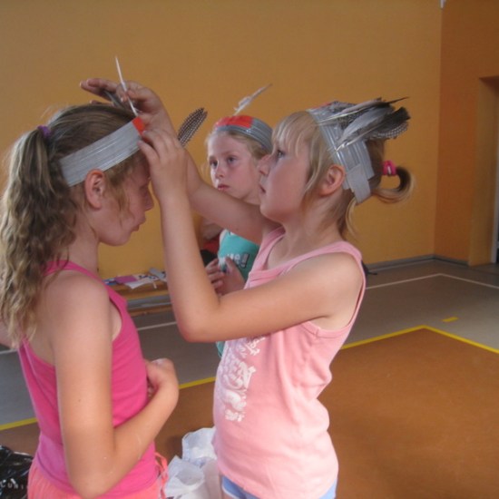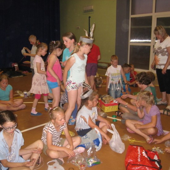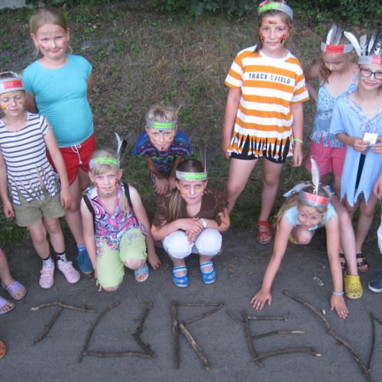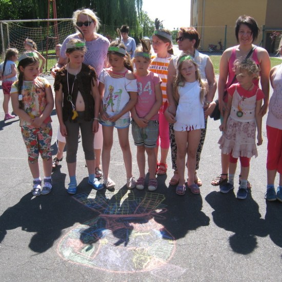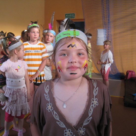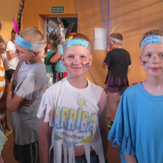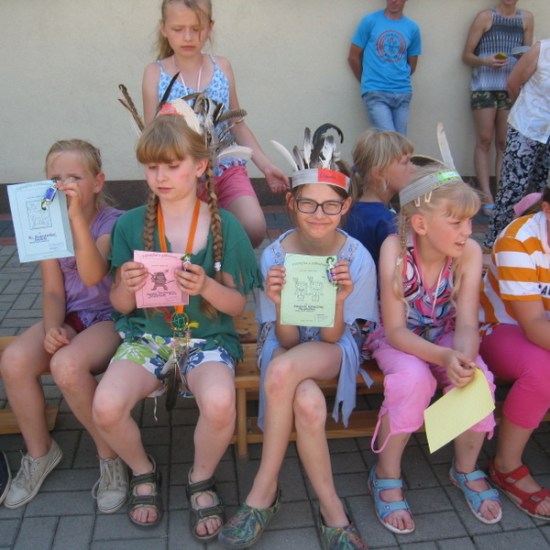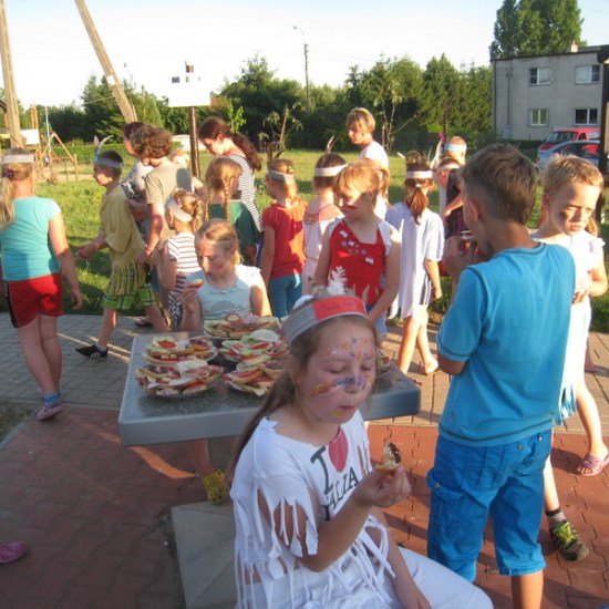 Ostatnie dwa dni półkolonii to biwak z noclegiem w szkole. Nauczycielki p. Beata Matyjaszczyk, p. Dorota Gronczewska i Krystyna Nowak realizowały z dziećmi projekt “W indiańskiej wiosce”. Wstępem do zajęć było obejrzenie filmu edukacyjnego wprowadzającego w tematykę indiańskich obyczajów. Następnie dzieci inspirowane sugestiami nauczycielek własnoręcznie wykonały elementy indiańskiego stroju: okrycia z frędzlami i pióropusze. Dzieci zostały podzielone na szczepy, musiały wybrać swoją nazwę i nadać sobie indiańskie imię. Dalej bawiono się w tej konwencji. Były indiańskie barwy na twarzach, indiańskie podchody, ognisko, robienie łapaczy snów, czyli indiańskich amuletów. Po tylu wrażeniach trudno było małym Indiankom i Indianom zasnąć, tym bardziej, że taki nocleg poza domem razem z rówieśnikami był dla nich nie lada frajdą. Na drugi dzień dzieci wykonały według własnych pomysłów instrumenty. Kiedy przybyli rodzice, dzieci zaprezentowały się w swoich indiańskich strojach w tańcu i piosence przygrywając sobie do rytmu własnoręcznie wykonanymi instrumentami. Z rodzicami bawiliśmy się w zabawę integracyjną, potem budowaliśmy wspólnie wigwamy. Dzieci przebywające w wigwamie wyciągały swoje bose stopy, a rodzice mieli rozpoznać, które stopy należą do ich dziecka. Ostatnim elementem wspólnej zabawy było malowanie kredą na boisku totemu swojego szczepu. Dołączyło się też młodsze rodzeństwo. Tak uczniowie naszej “małej wioski” poznali “wielki świat” i zrealizowali program tegorocznej półkolonii. Na podsumowanie biwaku i całej półkolonii uczestnicy otrzymali pamiątki, soki i słodycze.