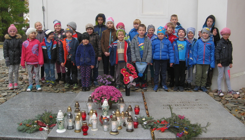 Uczniowie klas I-III z wychowawczyniami wysprzątali grób patrona i jego bliskich, położyli wykonane przez siebie wiązanki, zapalili znicze i tak rozpoczęli zbliżający się nostalgiczny czas Święta Zmarłych.