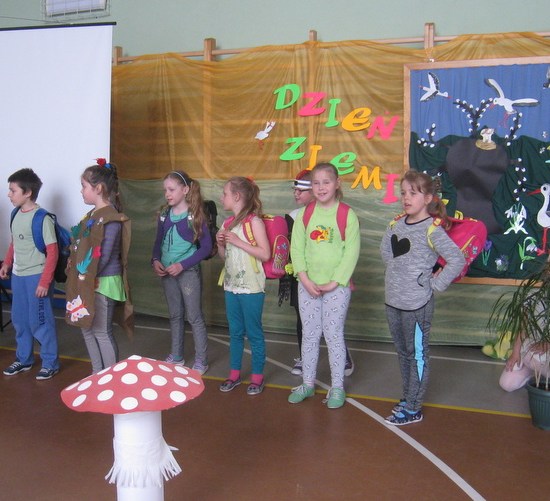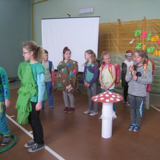26 kwietnia obchodziliśmy w naszej szkole Dzień Ziemi. Z tej okazji wszyscy przyszliśmy na zajęcia z zielonymi elementami stroju. O godzinie 11.00 rozpoczęliśmy imprezę obejrzeniem filmu o wodzie, sposobach jej oczyszczania i uzdatniania. Po rozmowach na temat oszczędnego gospodarowania wodą uczniowie klas I – III i mili goście , czyli uczniowie „zerówki” zaprezentowali krótkie inscenizacje o poszanowaniu i ochronie przyrody. Dzieci miały przygotowane ciekawe, kolorowe stroje i bardzo przekonująco odgrywały swoje role. Potem podzieleni na cztery zespoły współzawodniczyliśmy ze sobą w licznych konkurencjach: rozwiązywaniu ekotestu, układaniu obrazków z puzzli, rzucie papierowymi kulkami do kosza, sadzeniu „kwiatków”. Następnym etapem był spacer do lasu, gdzie czekał na nas pan leśniczy Jarek Biegański. Mimo chłodnej aury z uwagą słuchaliśmy opowieści o zwierzętach zamieszkujących nasze lasy. Oglądaliśmy przyniesione przez pana leśniczego poroża koziołków, danieli i jeleni. Po spotkaniu wróciliśmy do szkoły, gdzie odpoczywaliśmy rozwiązując krzyżówki i zagadki o tematyce przyrodniczej .