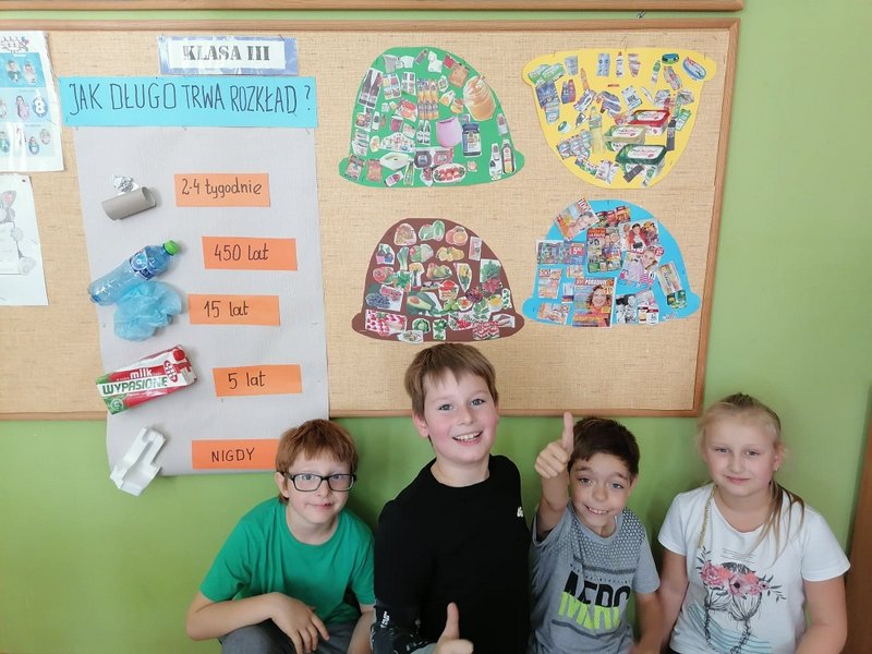 W ramach akcji „Sprzątanie świata” nasza szkoła przystąpiła do realizacji projektów o tematyce ekologicznej. W klasie 3 głównym tematem zajęć była segregacja śmieci i pozyskiwanie wiadomości związanych z czasem rozkładu poszczególnych rodzajów śmieci.