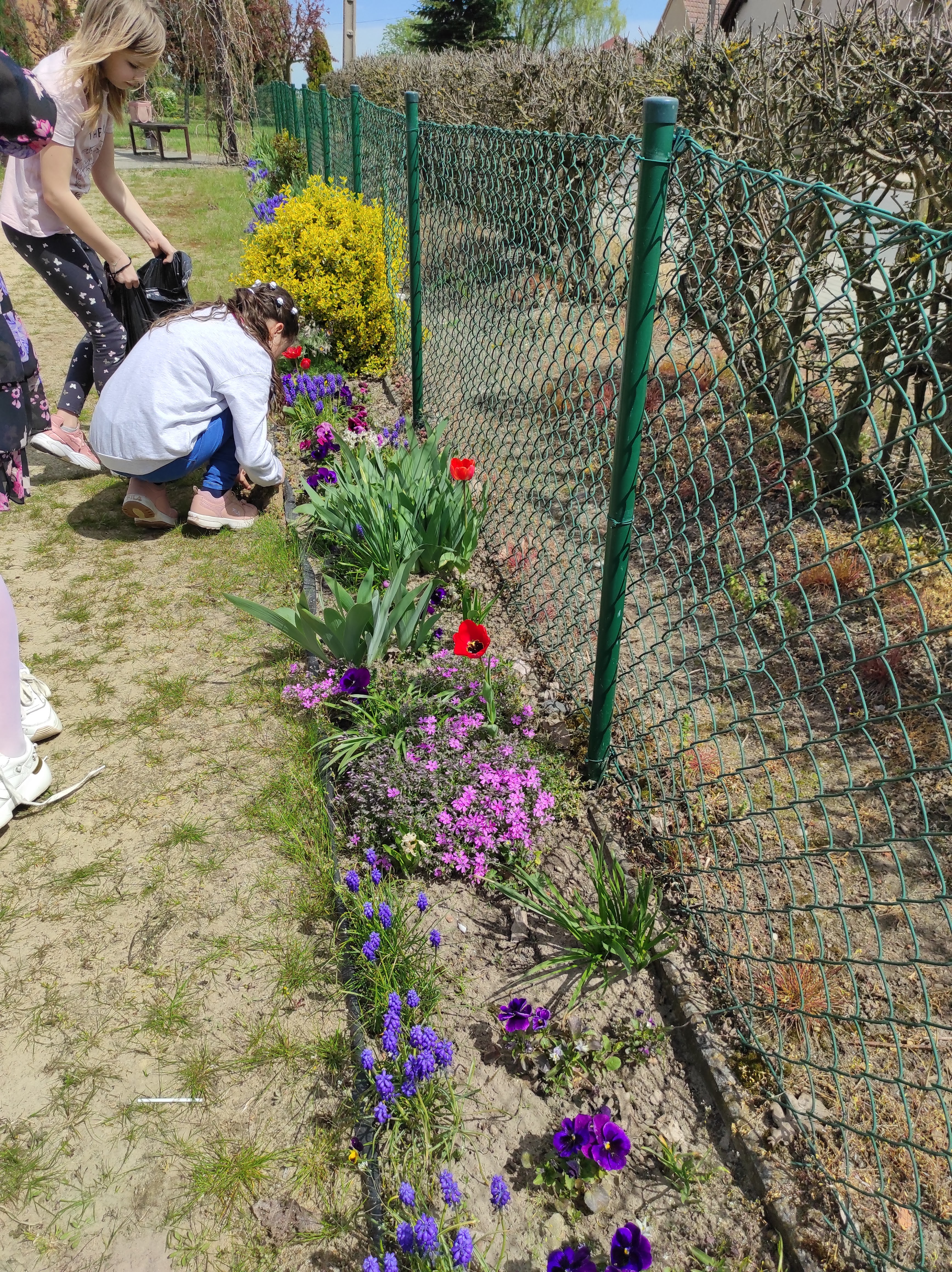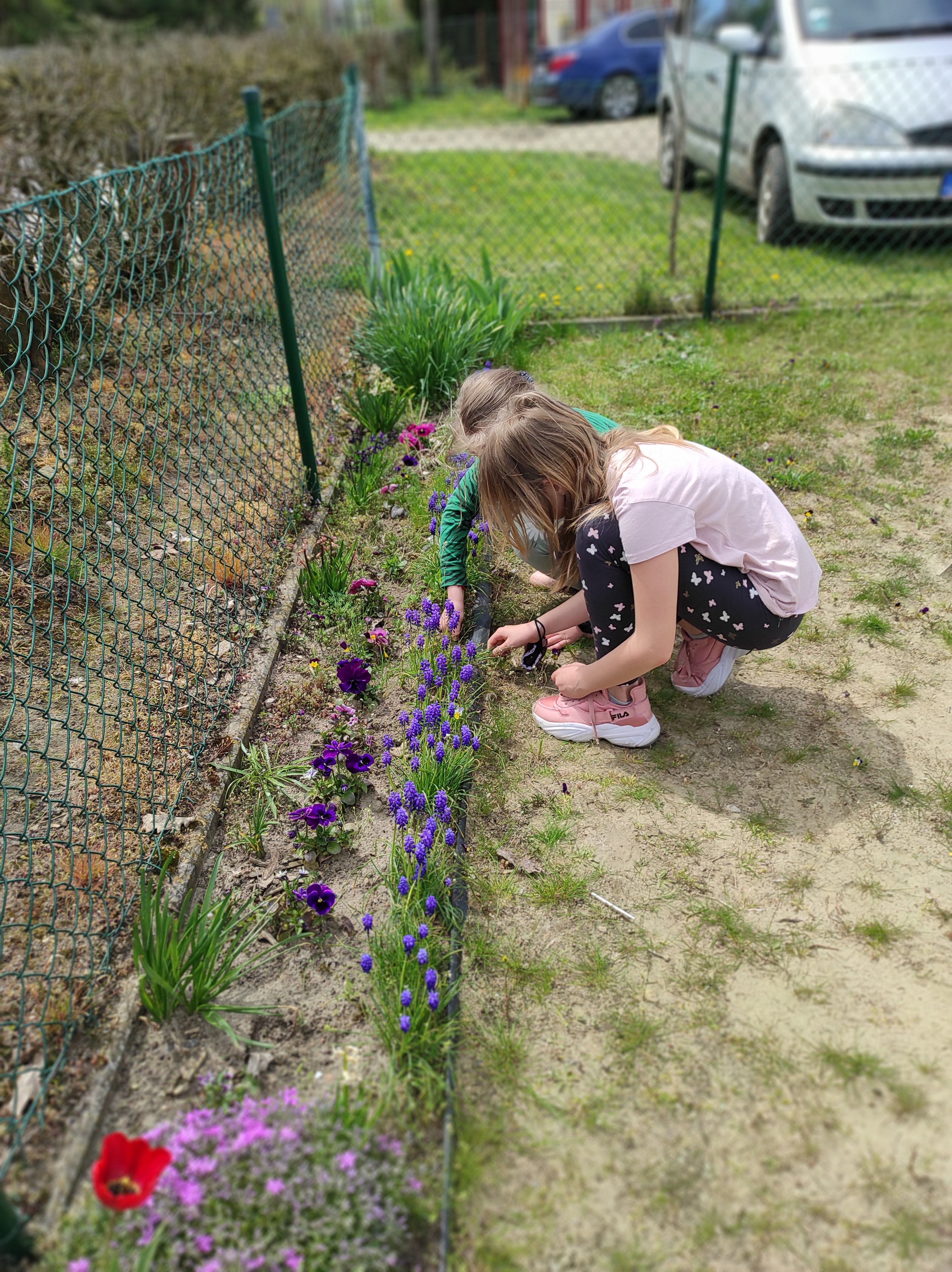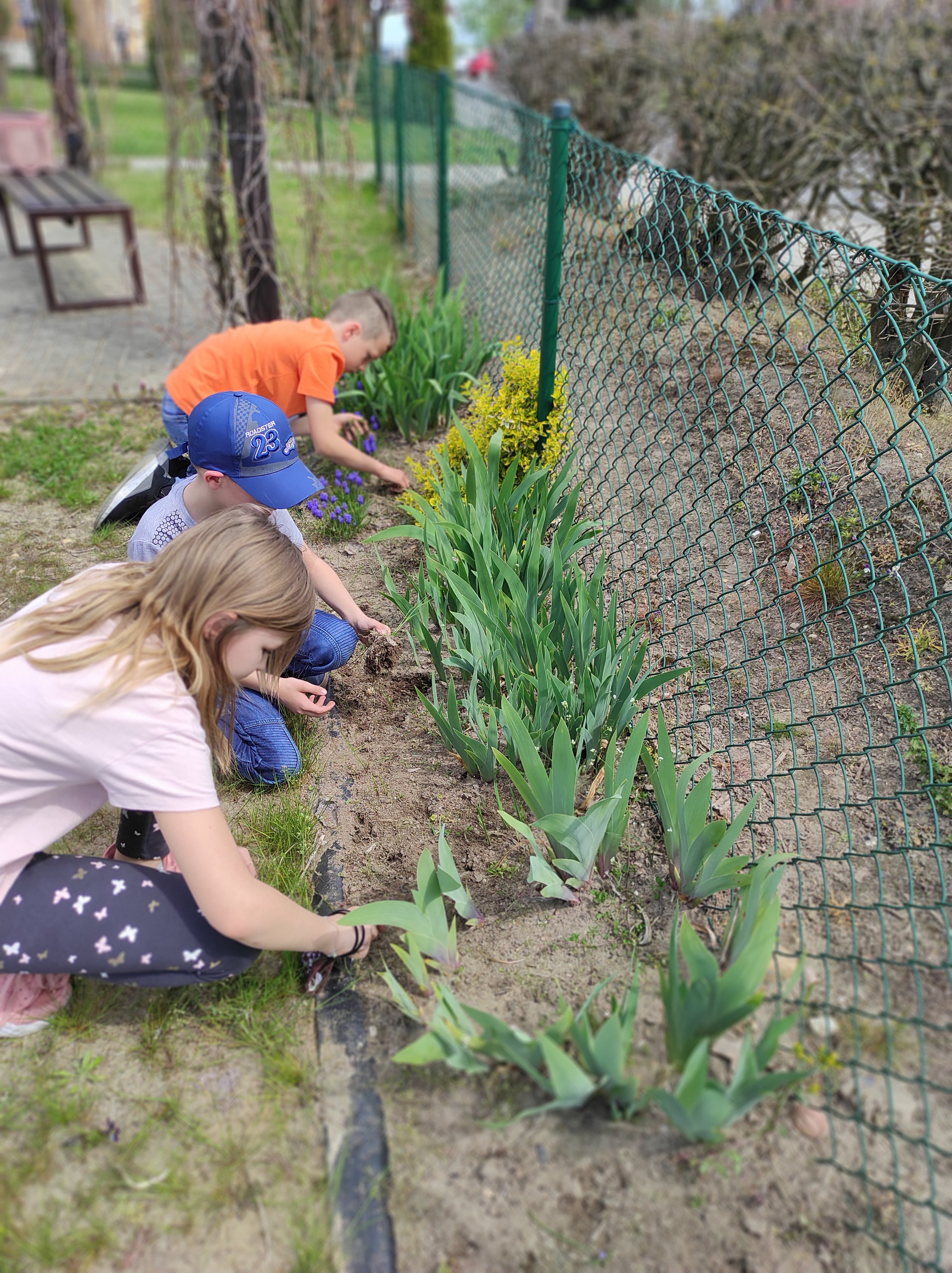 Klasa trzecia postanowiła połączyć przyjemne z pożytecznym i przy okazji pobytu na placu zabaw uporządkowała nasz ogródek szkolny. Na rabatkach przekwitły już hiacynty i krokusy teraz wdzięczą się w słońcu szafirki, bratki, sasanki i tulipany. Pojawił się też niewielkie rozchodniki.