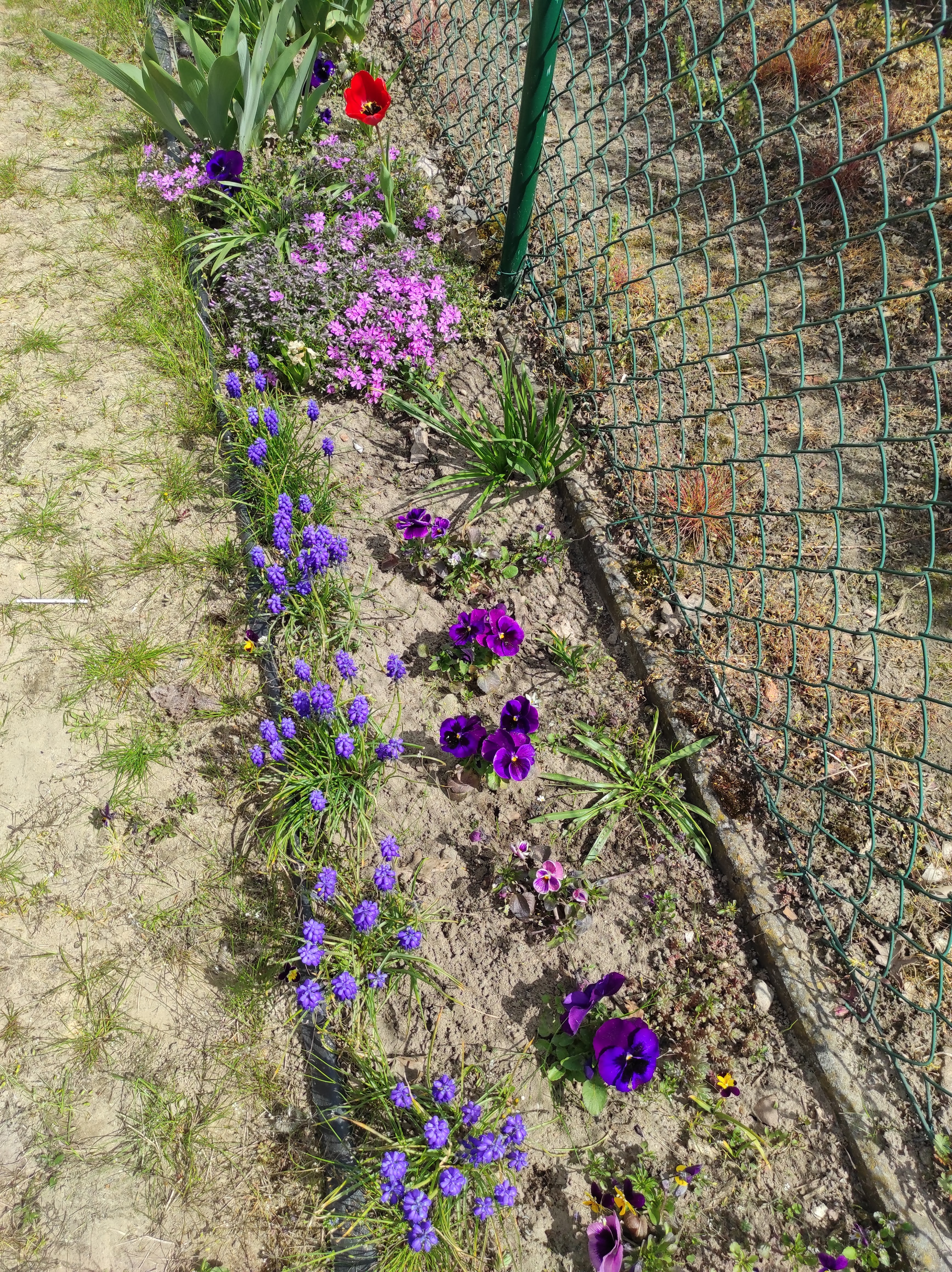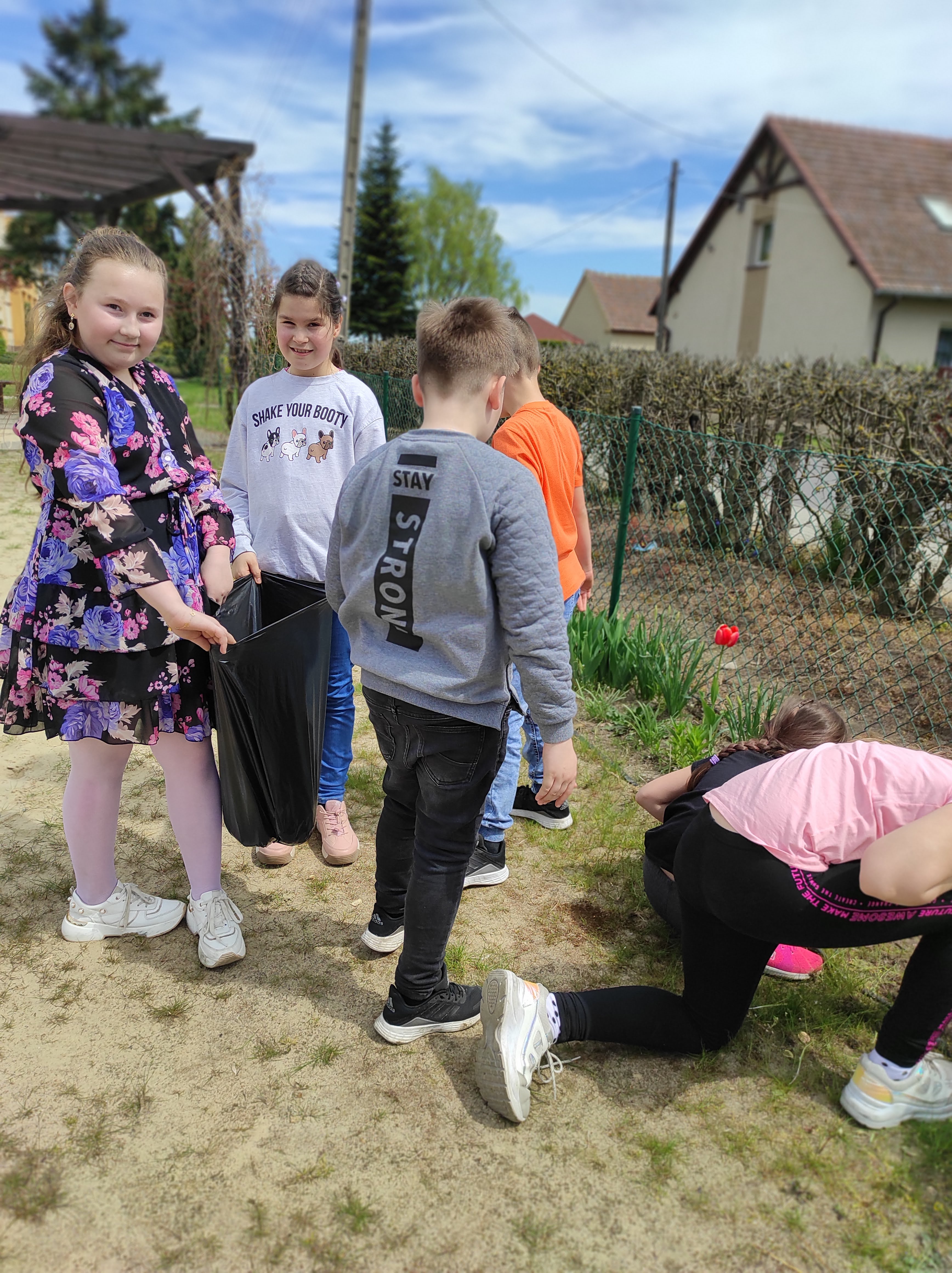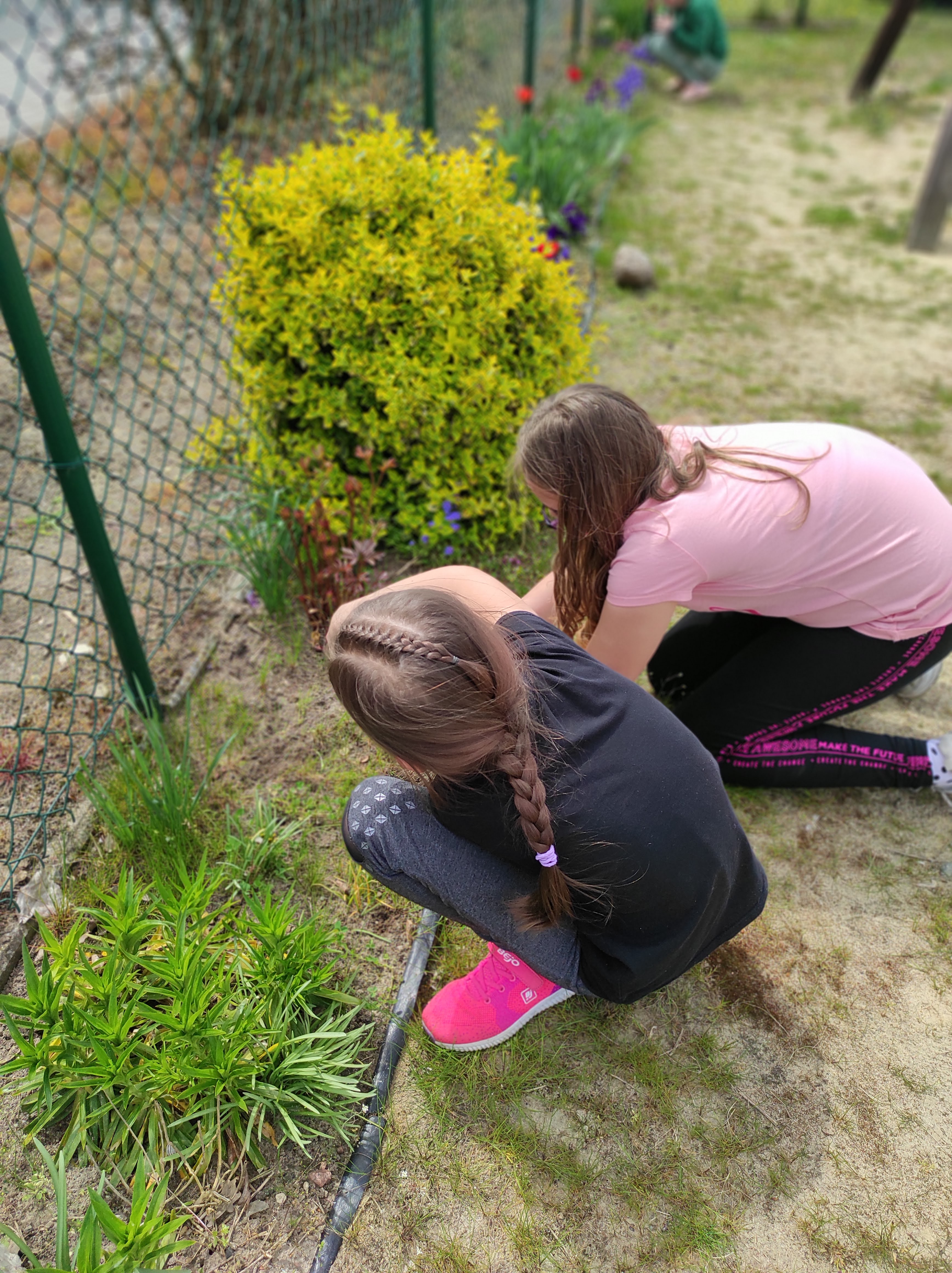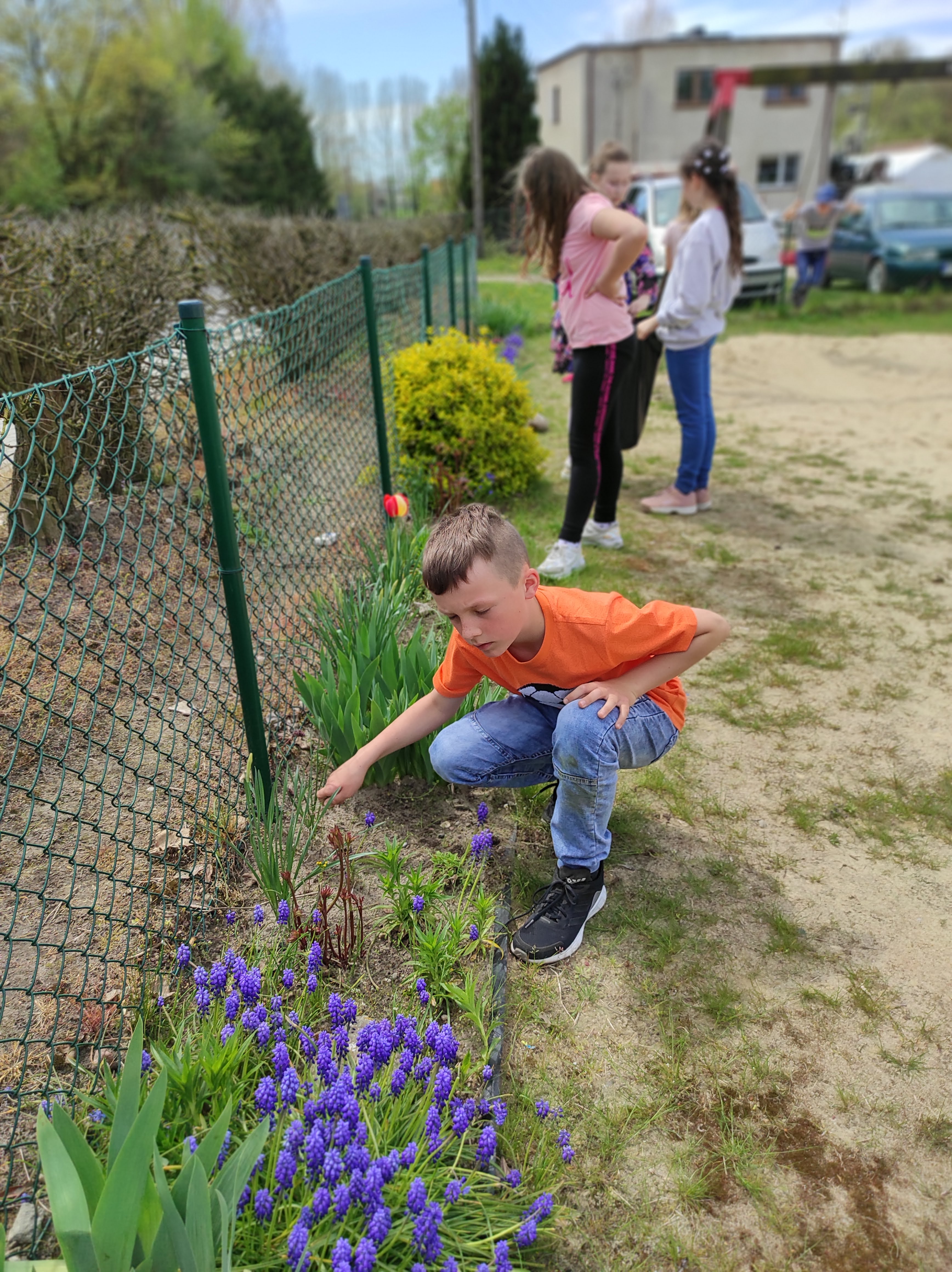 Klasa trzecia postanowiła połączyć przyjemne z pożytecznym i przy okazji pobytu na placu zabaw uporządkowała nasz ogródek szkolny. Na rabatkach przekwitły już hiacynty i krokusy teraz wdzięczą się w słońcu szafirki, bratki, sasanki i tulipany. Pojawił się też niewielkie rozchodniki.