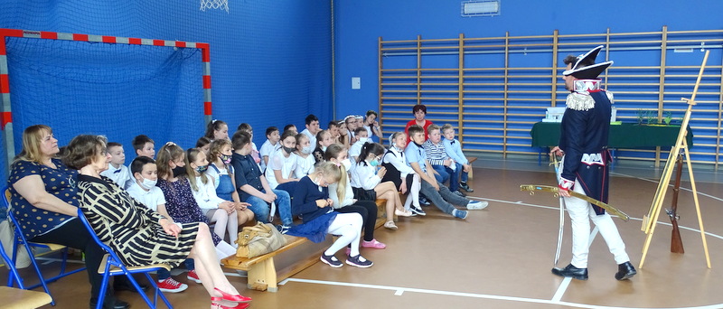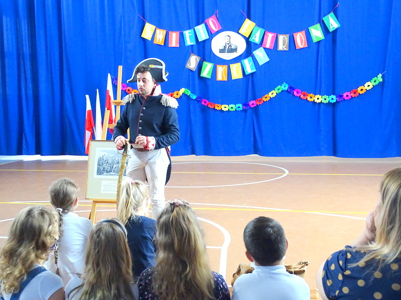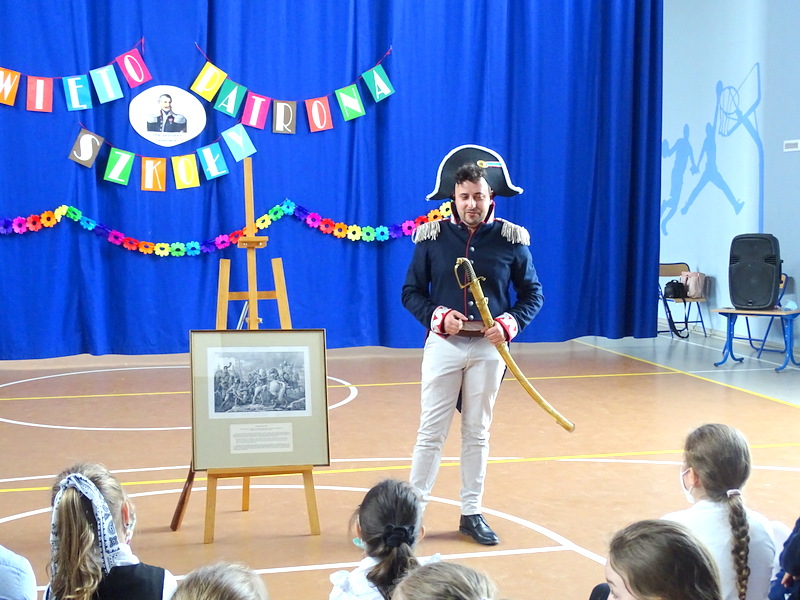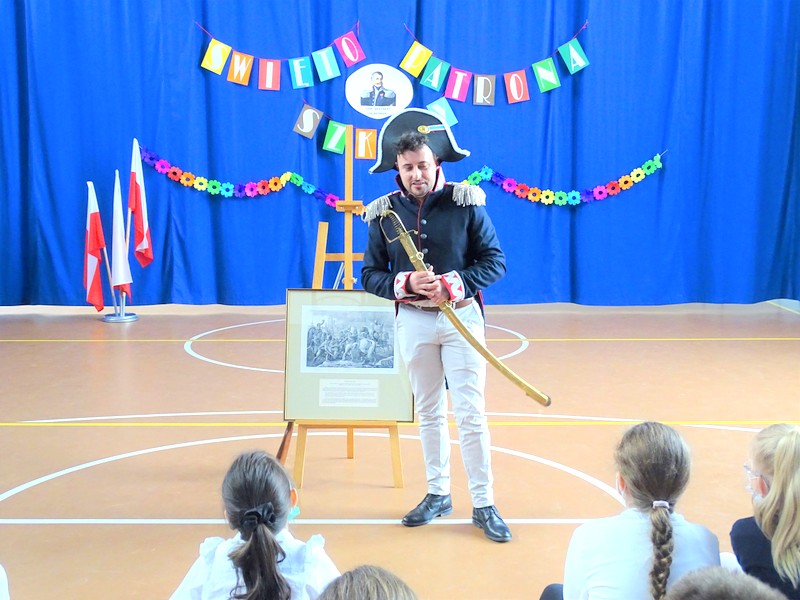 Co roku pamiętamy o naszym Patronie i w dzień urodzin Dezyderego Chłapowskiego obchodzimy święto szkoły. W tym roku szkolnym było to święto wyjątkowe z kilku powodów. Po pierwsze Dzień Patrona zorganizowaliśmy po dwóch latach ze względu na pandemię, po drugie pierwszy raz w tym roku szkolnym zebraliśmy się wszyscy w sali (pamiętając o reżimie sanitarnym), a po trzecie gościliśmy samego generała Dezyderego Chłapowskiego. W rolę generała wcielił się dr Emilian Prałat, najlepszy znawca dziejów rodu Chłapowskich i absolwent naszej szkoły. Dzieci miały nie lada frajdę móc obejrzeć generalski mundur i akcesoria, które nasz gość poprzynosił. Uczniowie z zaciekawieniem słuchali opowieści o życiu naszego Patrona, o jego męstwie, mądrej taktyce wojskowej, pracowitości i rozsądnym gospodarowaniu.