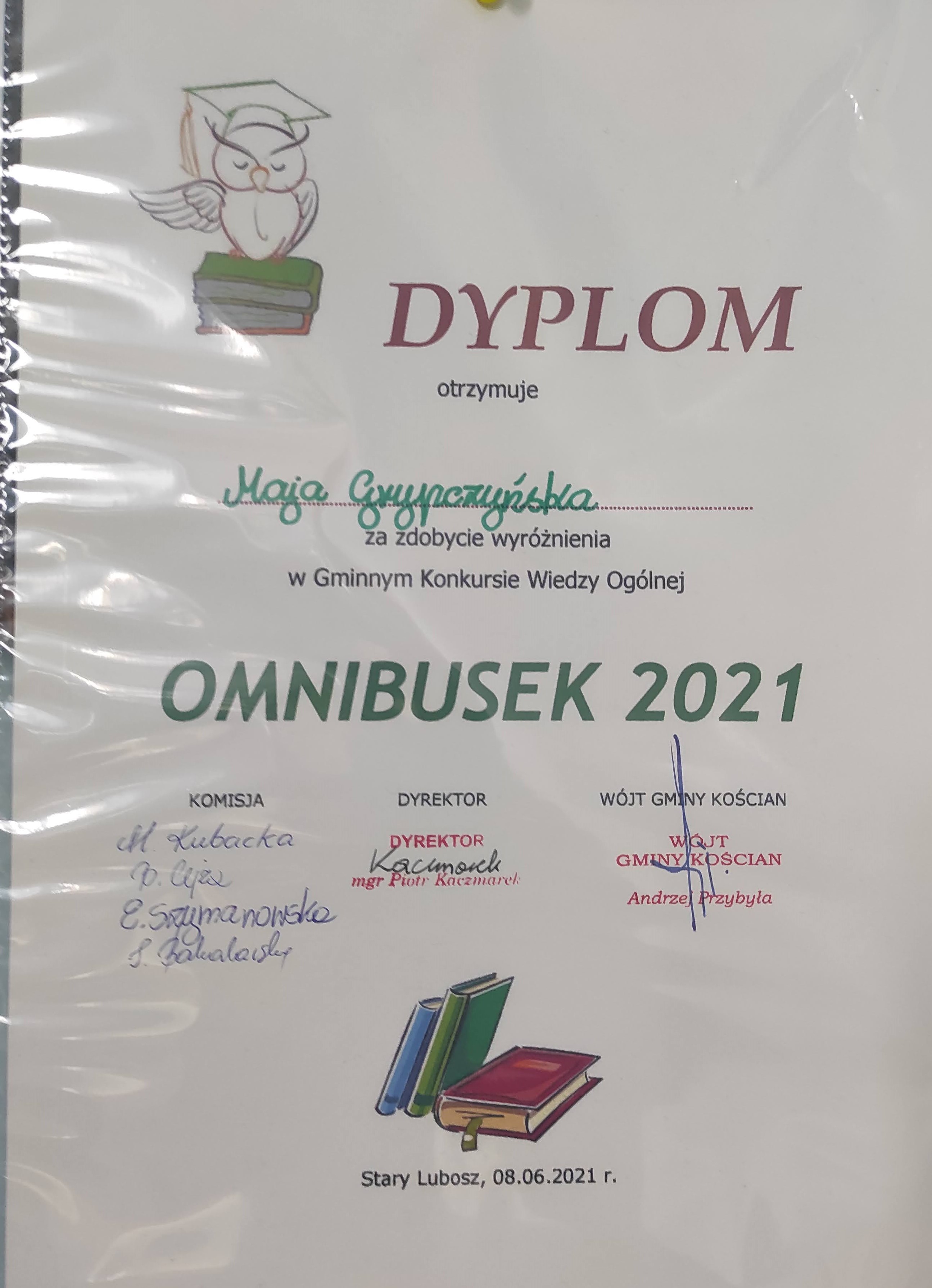 Wielkie gratulacje dla Mai Grypczyńskiej, która wygrawszy eliminacje klasowe, wzięła udział w gminnym konkursie wiedzy w Starym Luboszu i zajęła miejsce tuż za tytułowym Omnibuskiem! Brawo, Maja!