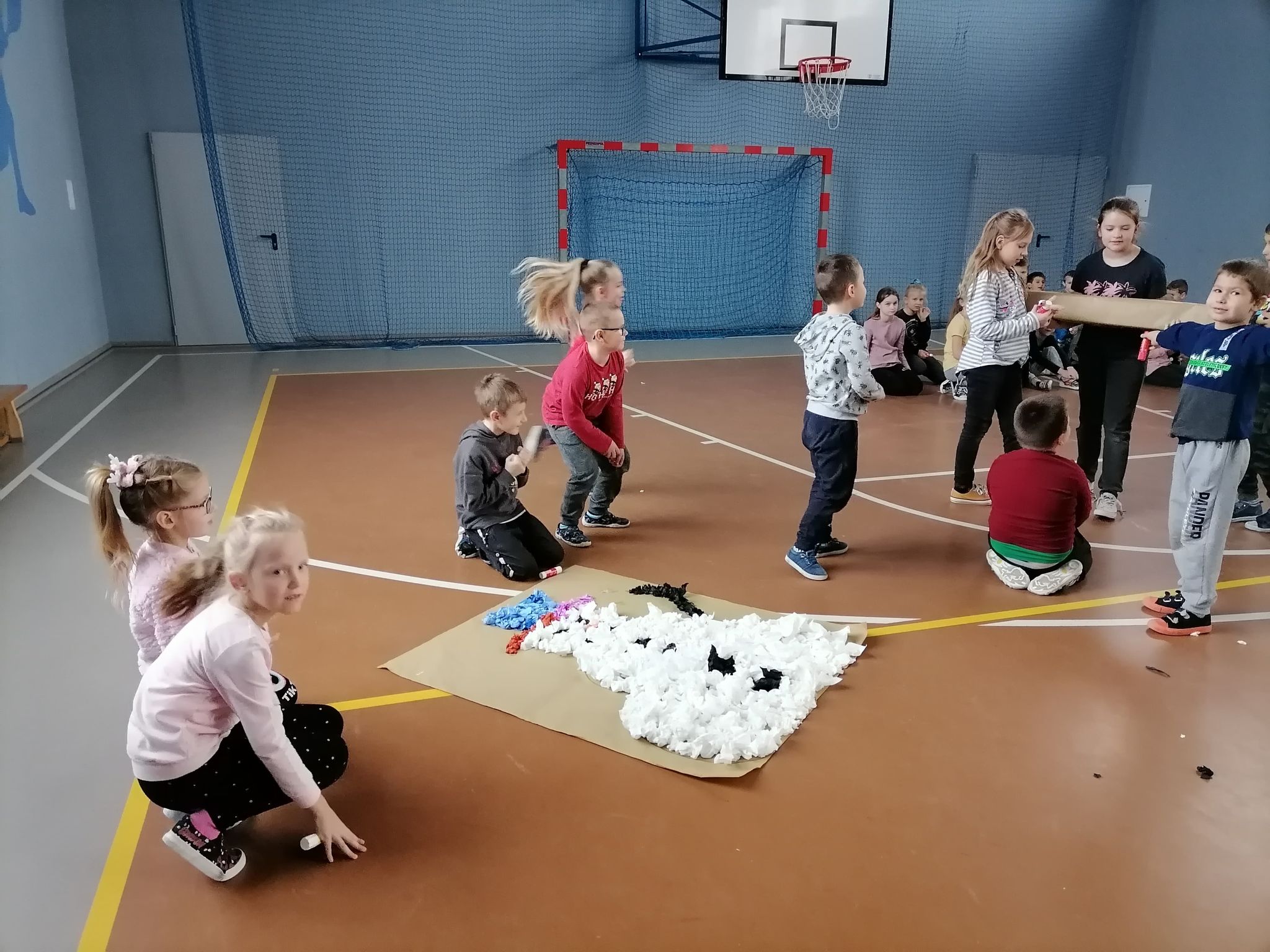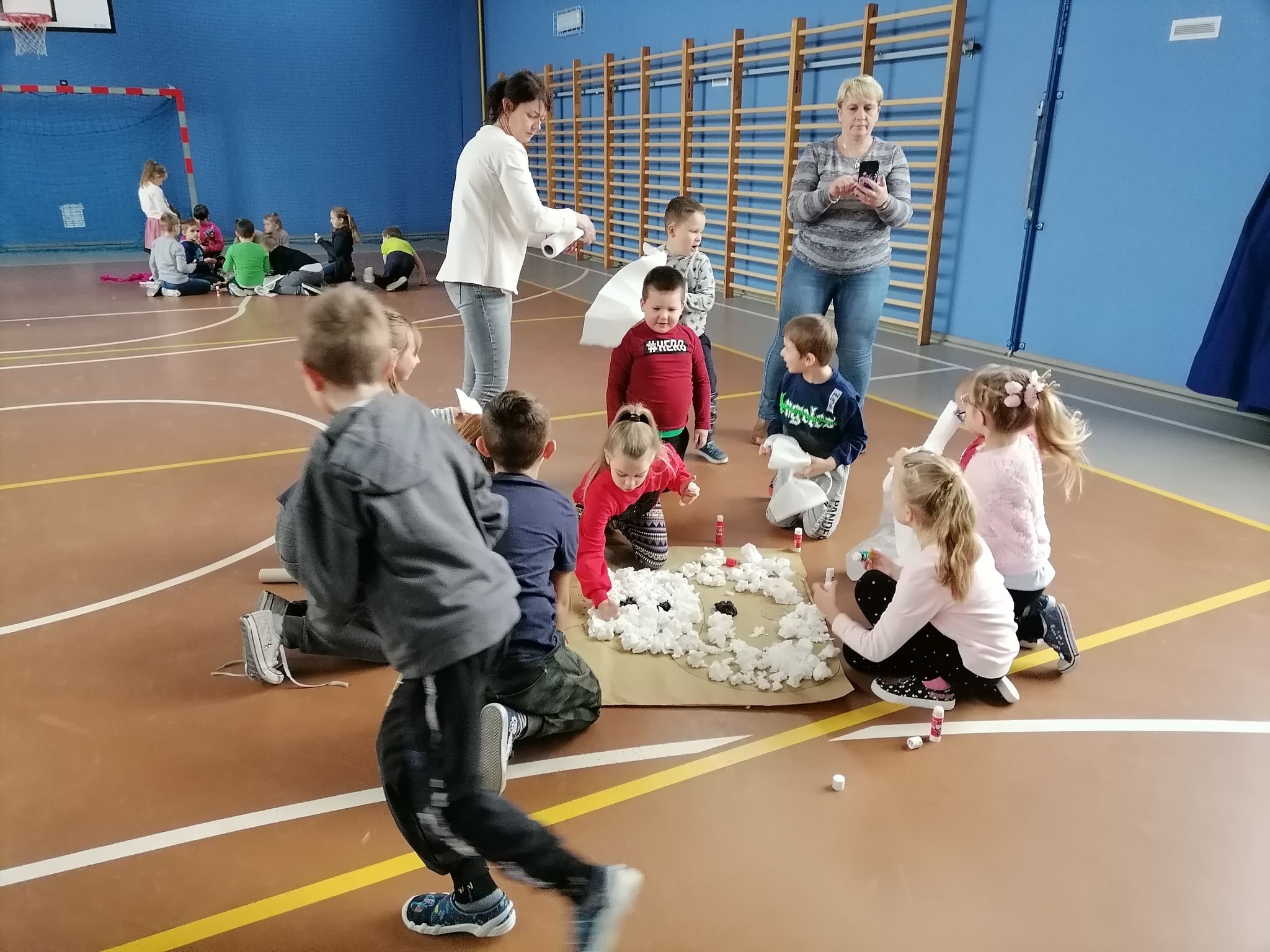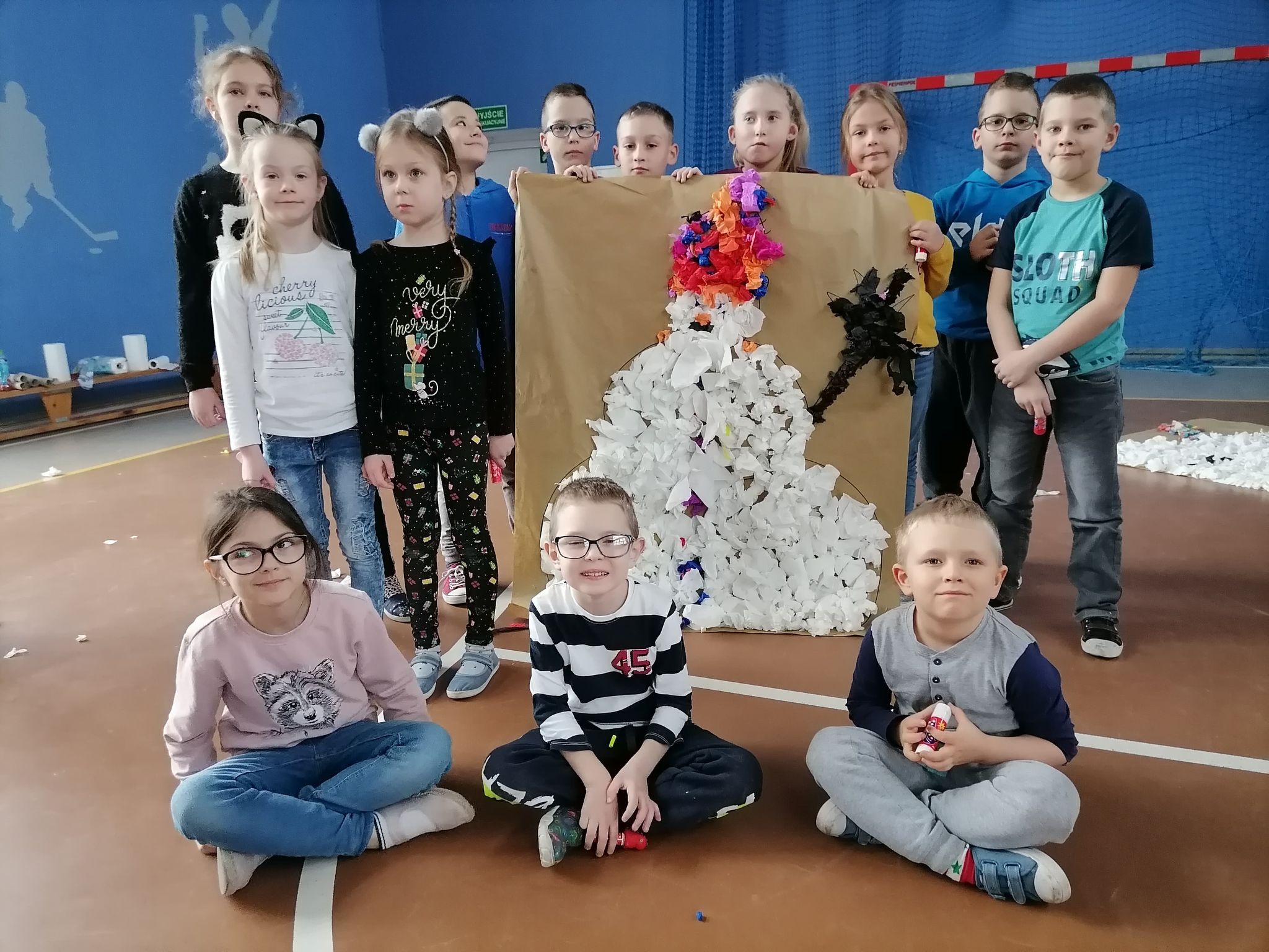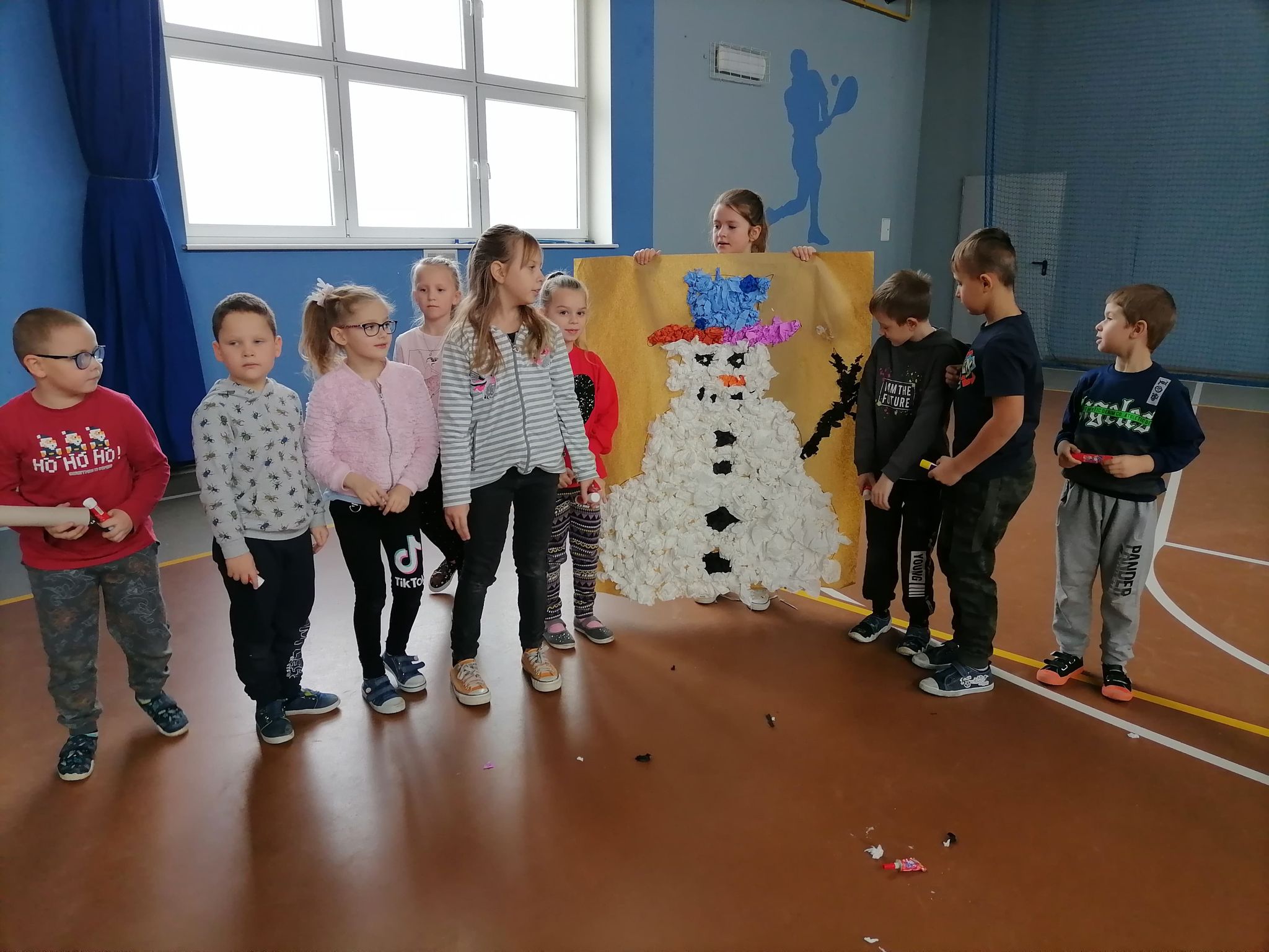 Kolejnym elementem programu było wykonanie ozdoby choinkowej i zawieszenie jej na wspólnej choince. Następnie podzieleni na grupy wykonaliśmy wielkoformatowe prace przedstawiające rodzinę bałwanków. Był to konkurs z nagrodami. Pierwsze miejsce zajęła grupa Taty Bałwanka. Nagrodą była podłogowa gra planszowa. Pozostałe grupy otrzymały również gry planszowe zakupione ze wspomnianych środków GKRPA. Gry będą wykorzystane w wolnym czasie i na zajęciach świetlicowych.