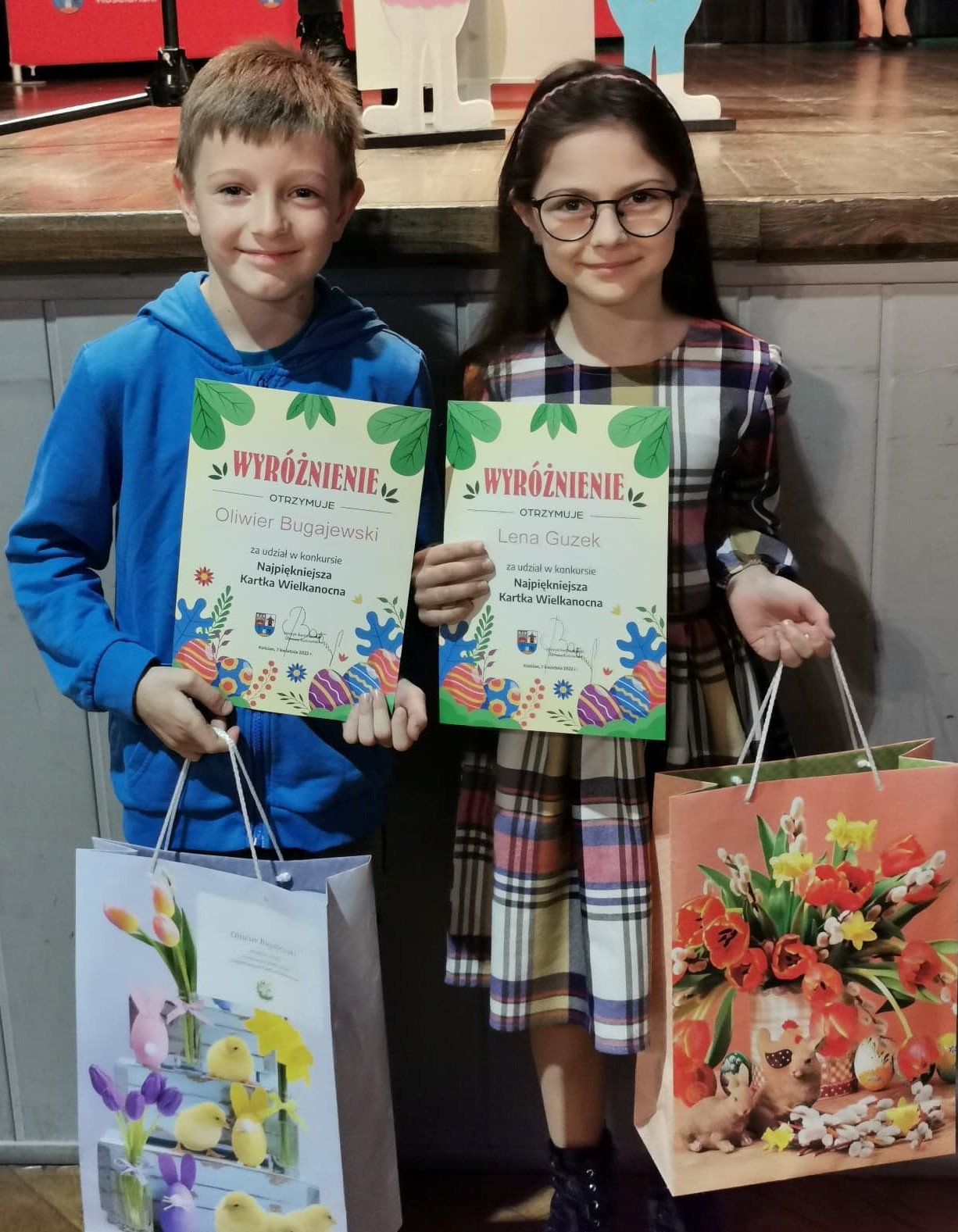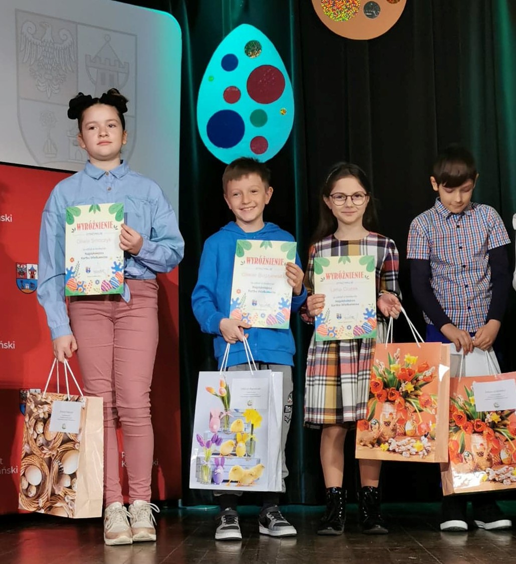 7 kwietnia 2022 roku uczniowie naszej szkoły zostali zaproszeni do Kościańskiego Ośrodka Kultury na ogłoszenie wyników powiatowego konkursu na „Najpiękniejszą Kartkę Wielkanocną”. Z młodymi artystami – autorami nagrodzonych i wyróżnionych prac – spotkała się wicestarosta Dorota Słowińska. W konkursie wzięło udział ogółem 339 osób – uczniów klas I-III szkół podstawowych z 21 szkół z terenu powiatu kościańskiego.