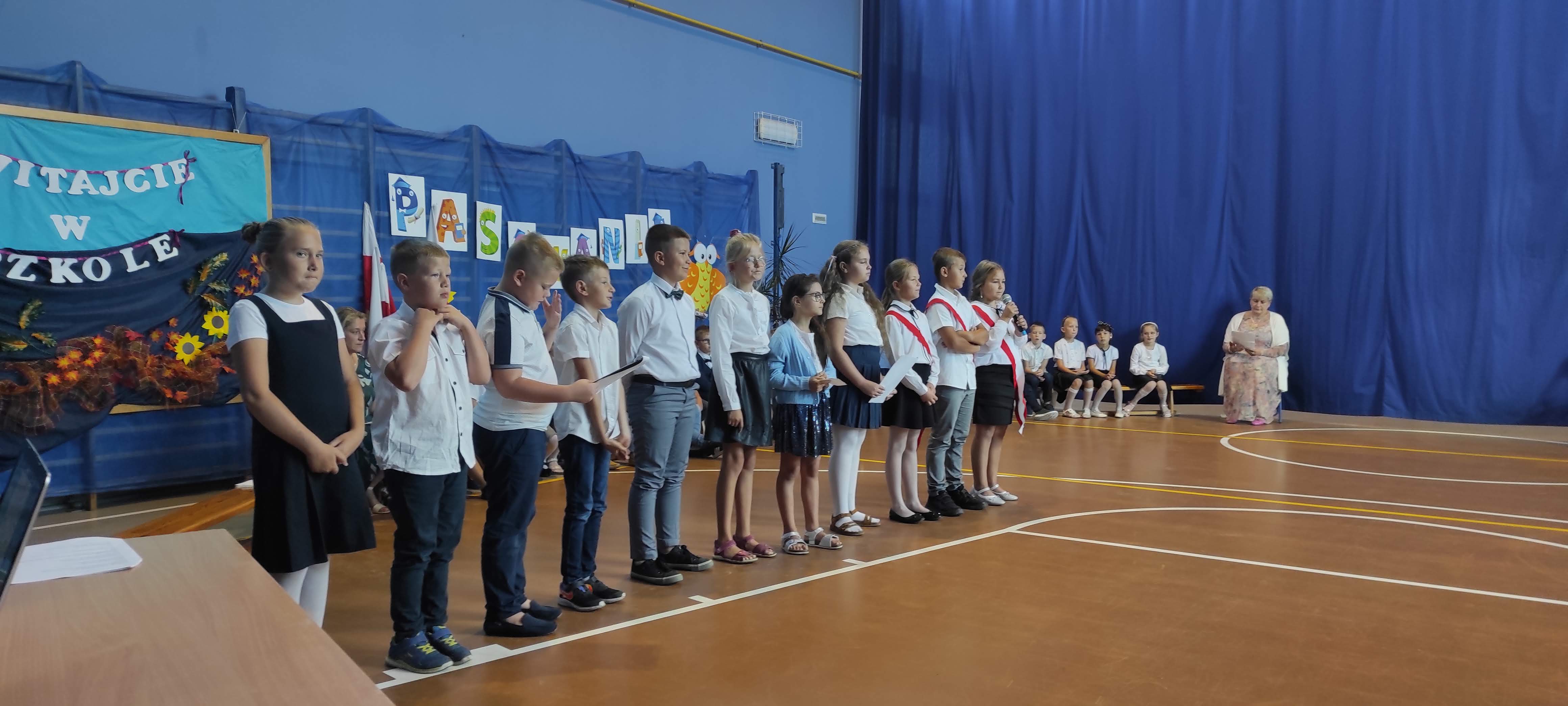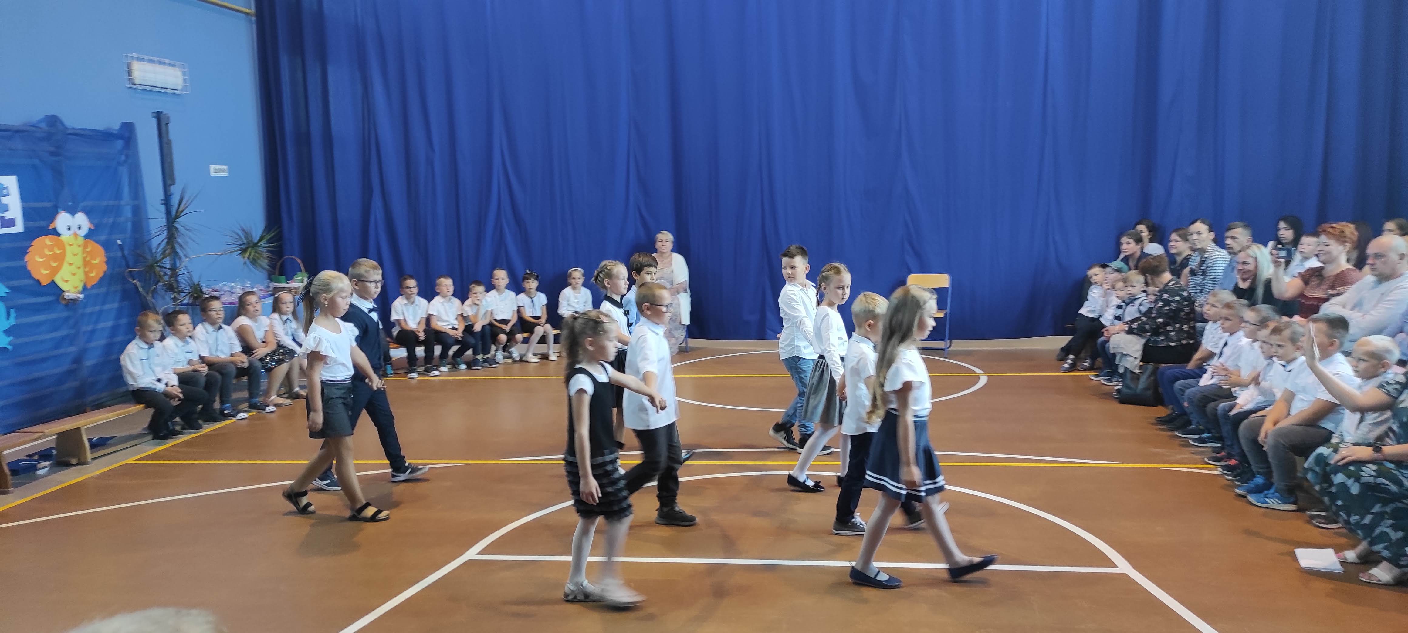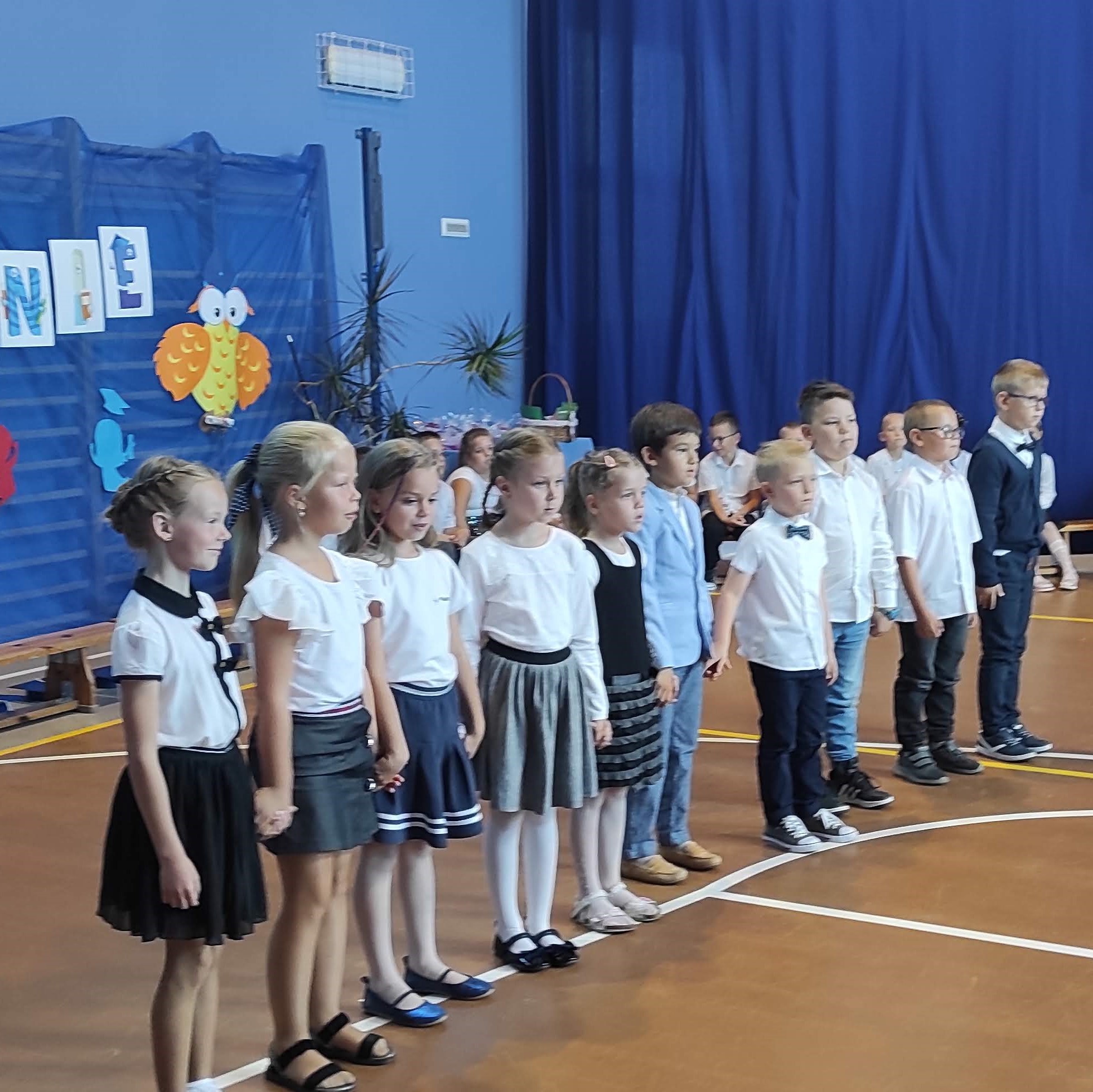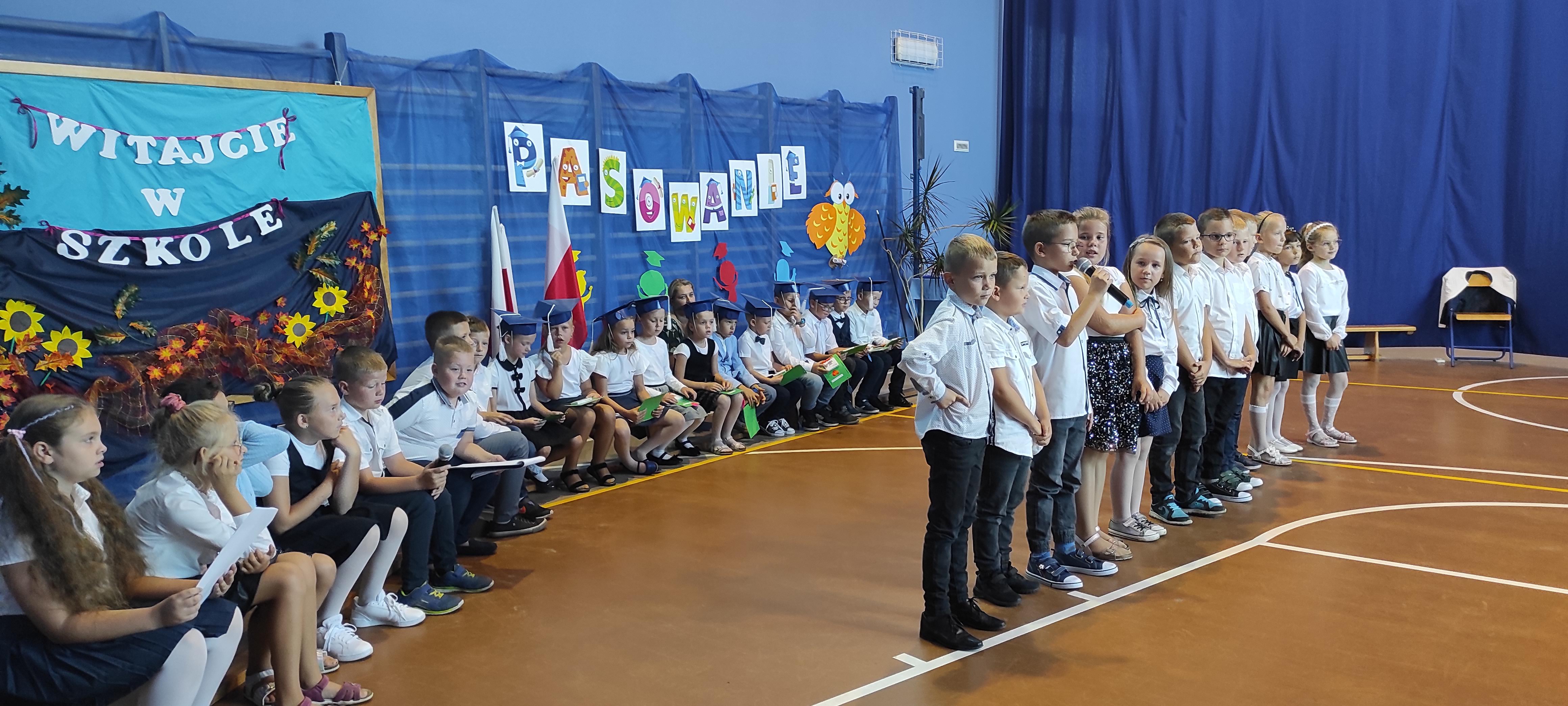 Upalne lato za nami. Po zbyt krótkich jak zwykle wakacjach szkoła wypełniła się gwarem dzieci. W tym pierwszym uroczystym dniu dzieciom towarzyszyli rodzice. Uroczystość rozpoczęli Zuzia i Antek witając wszystkich serdecznie. Każda klasa zaprezentowała krótki występ. Największa uwaga skupiona była na klasie pierwszej, która wykonaniem piosenki, krótkiej prezentacji i tańca udowodniła, że może przystąpić do pasowania. W tradycji szkoły jest powitanie pierwszaków przez uczniów klasy drugiej, którzy oprócz życzliwych słów mają dla kolegów skromny upominek. Pierwszacy otrzymali też pamiątkowe dyplomy i prezenty od Rady Rodziców. Pierwszy dzień w szkole upłynął w miłej atmosferze.