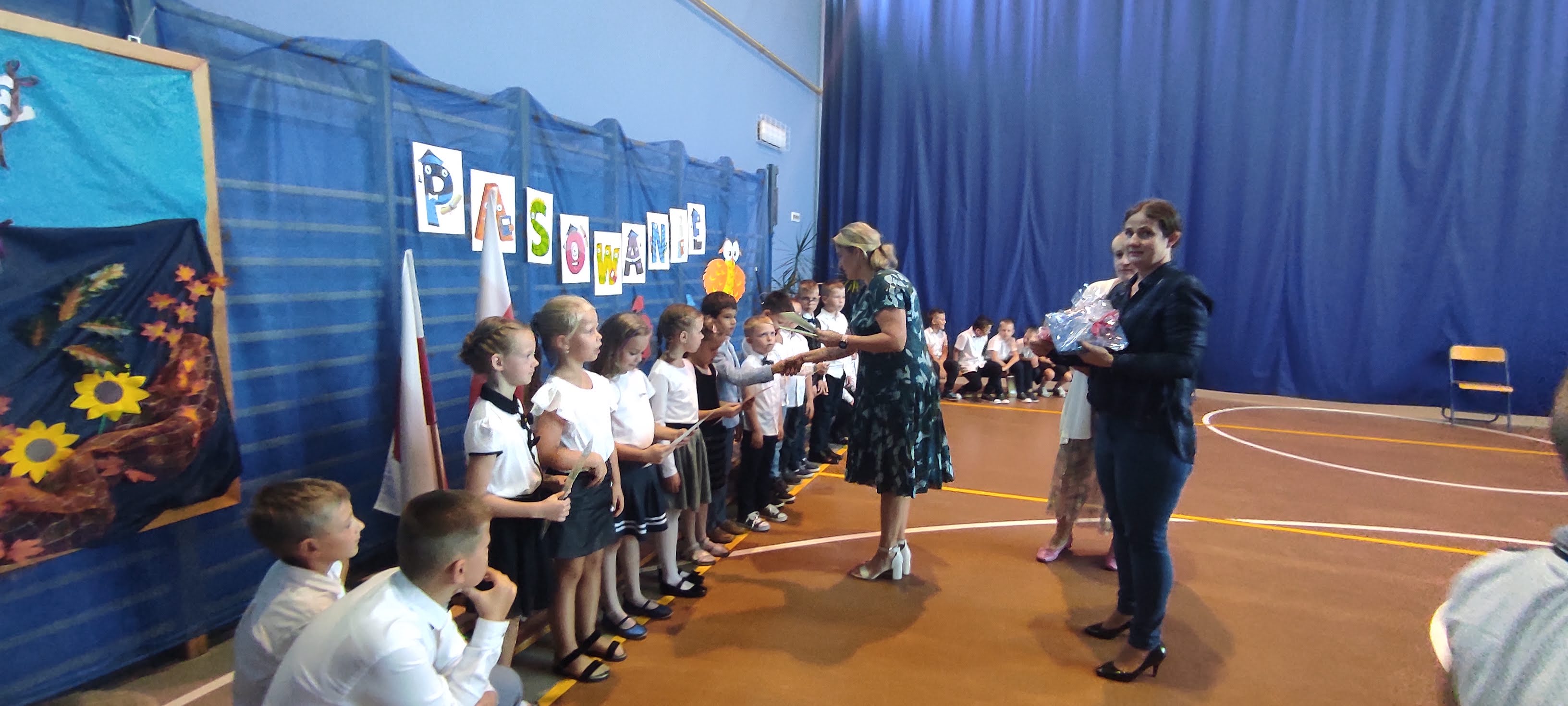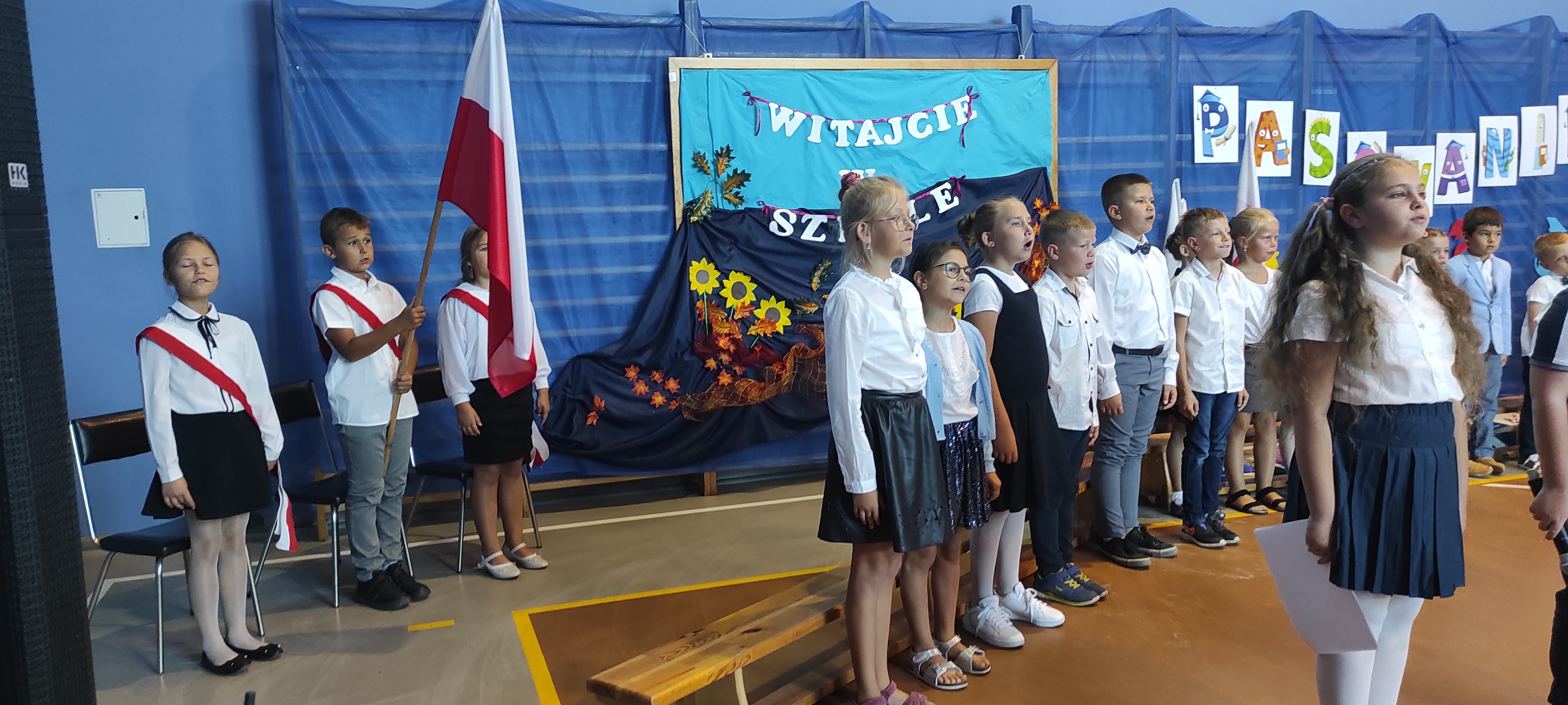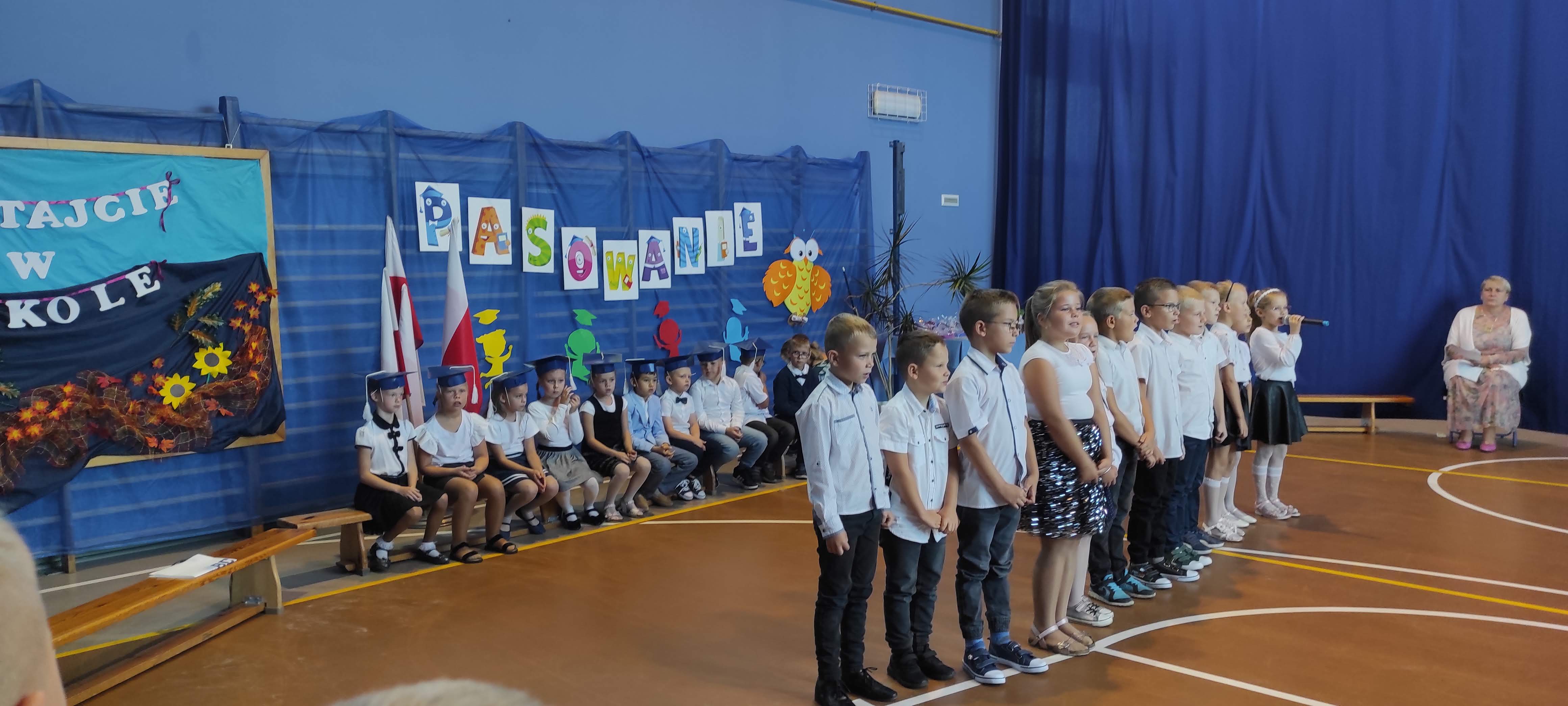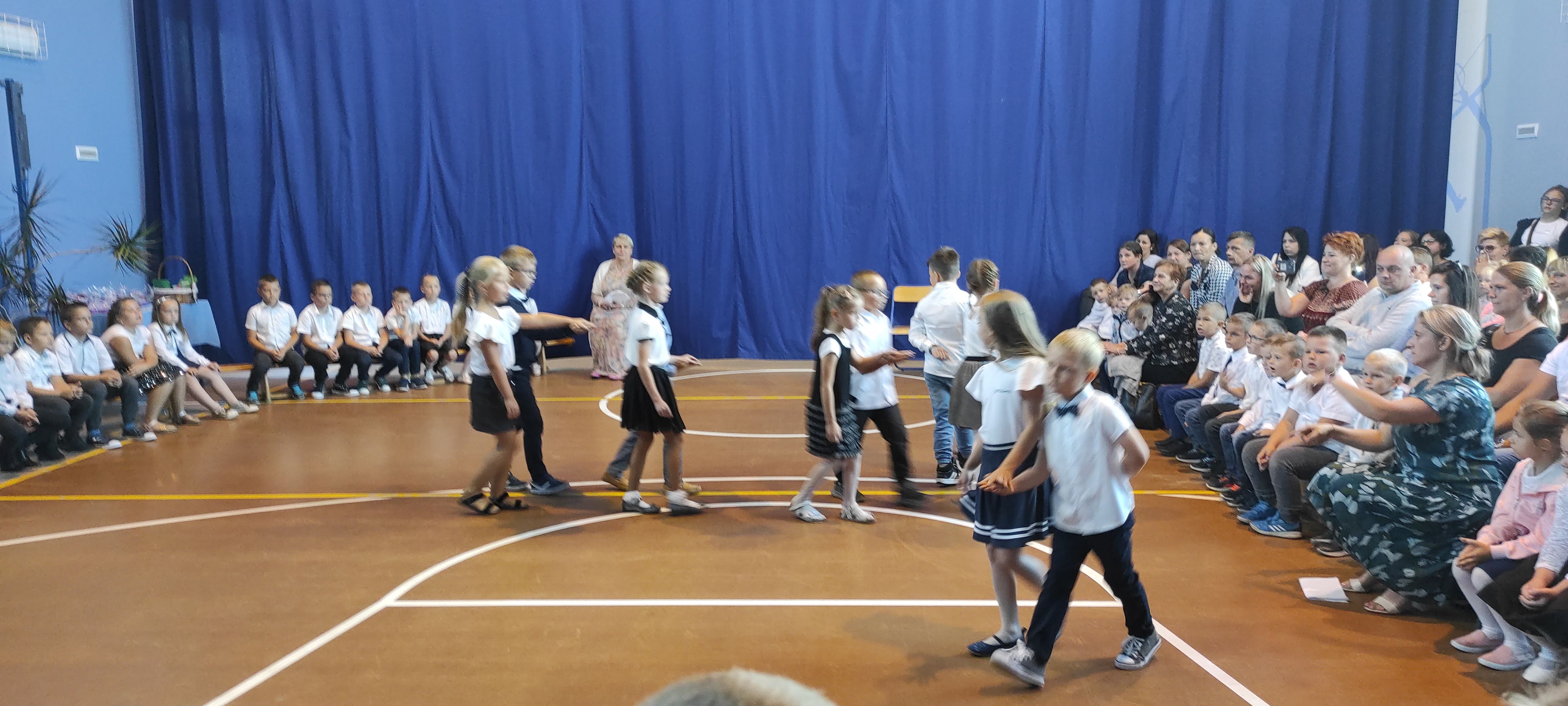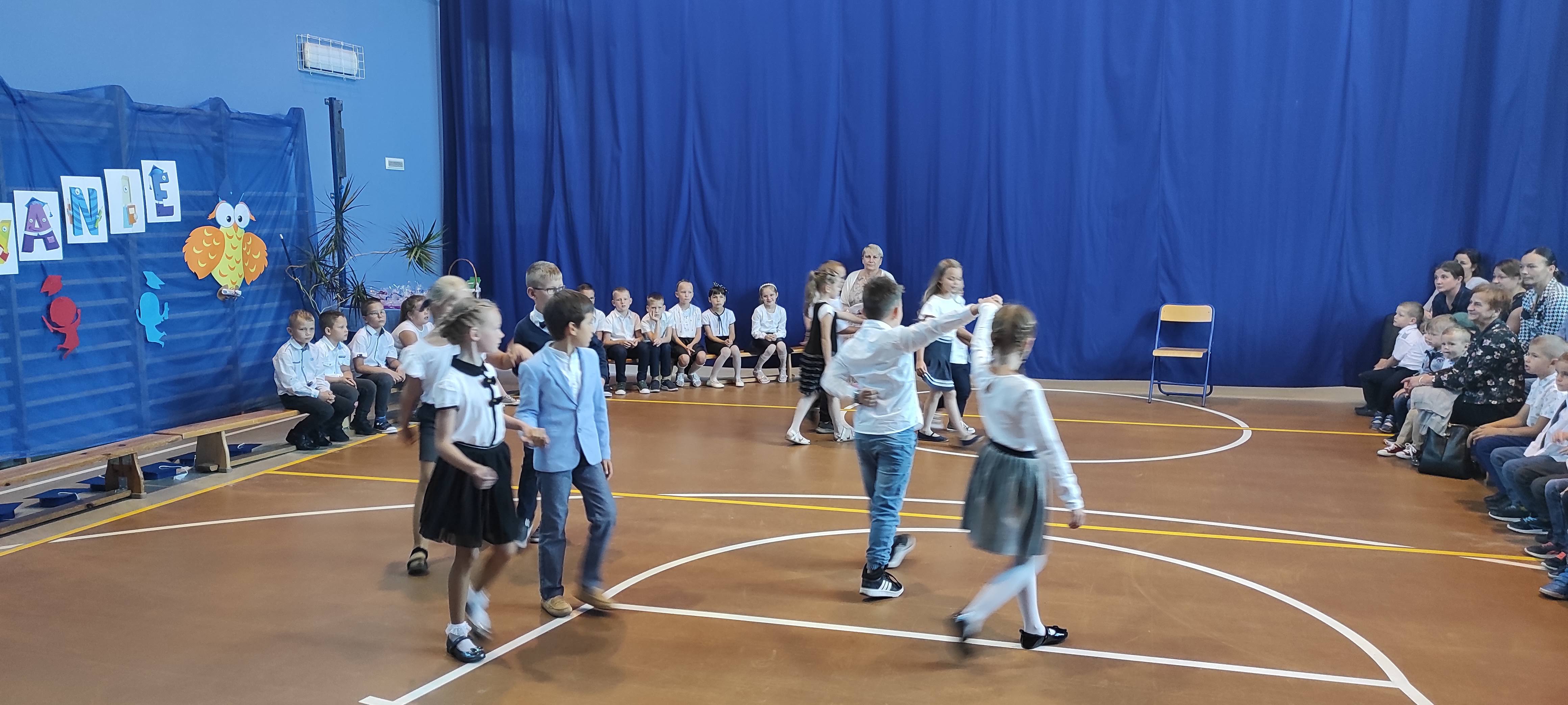 Upalne lato za nami. Po zbyt krótkich jak zwykle wakacjach szkoła wypełniła się gwarem dzieci. W tym pierwszym uroczystym dniu dzieciom towarzyszyli rodzice. Uroczystość rozpoczęli Zuzia i Antek witając wszystkich serdecznie. Każda klasa zaprezentowała krótki występ. Największa uwaga skupiona była na klasie pierwszej, która wykonaniem piosenki, krótkiej prezentacji i tańca udowodniła, że może przystąpić do pasowania. W tradycji szkoły jest powitanie pierwszaków przez uczniów klasy drugiej, którzy oprócz życzliwych słów mają dla kolegów skromny upominek. Pierwszacy otrzymali też pamiątkowe dyplomy i prezenty od Rady Rodziców. Pierwszy dzień w szkole upłynął w miłej atmosferze.