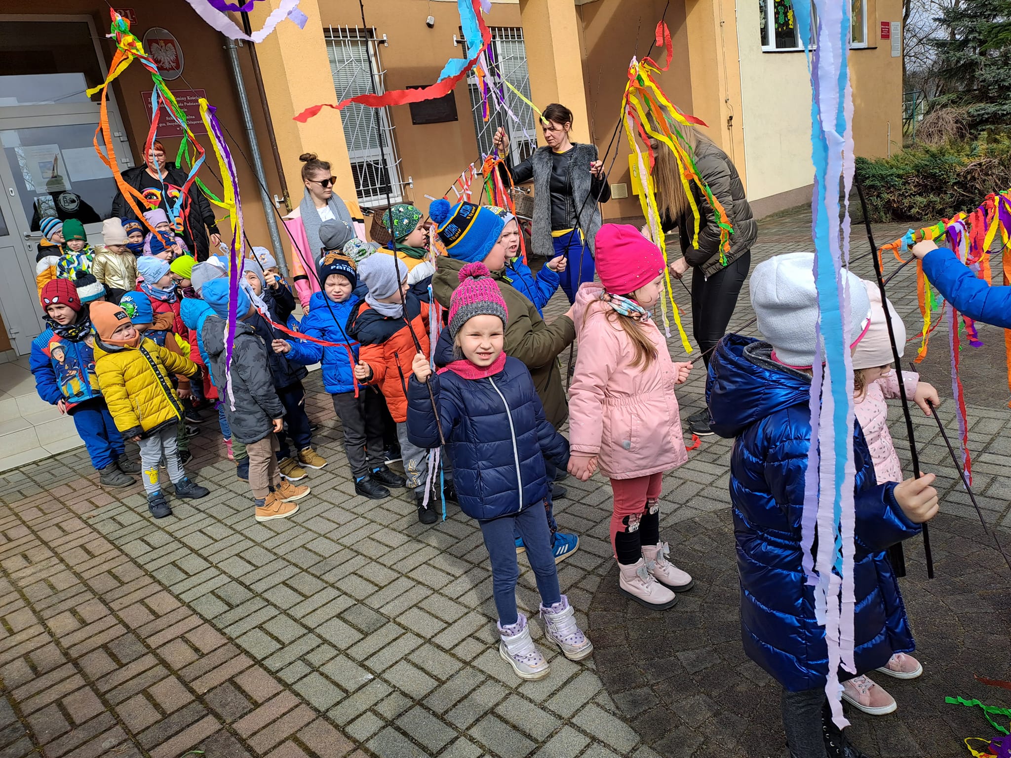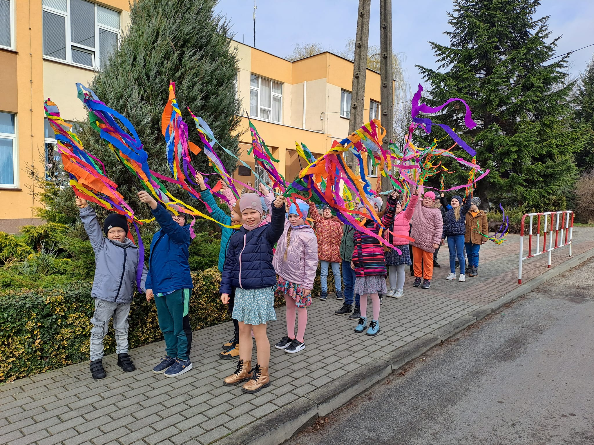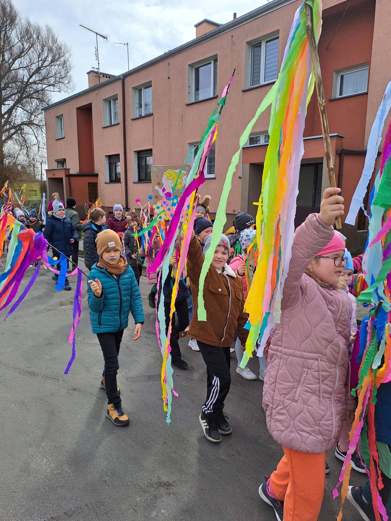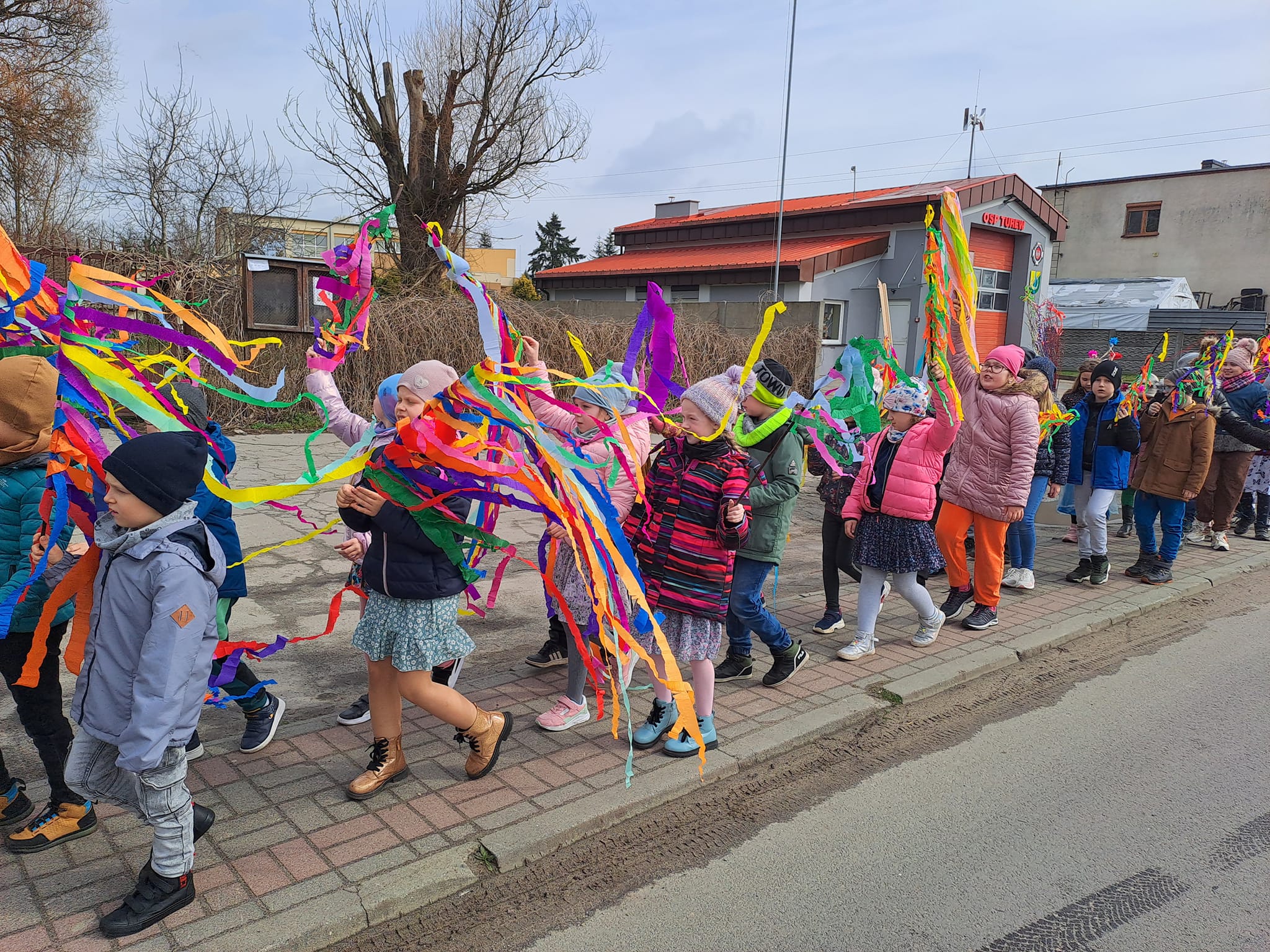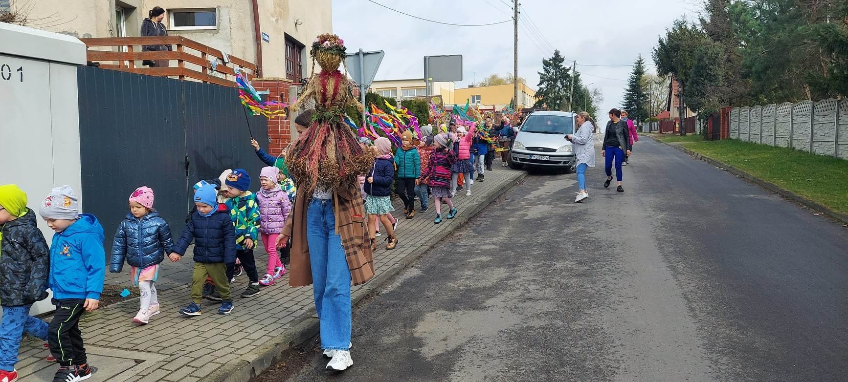 Wszystkie dzieci wyruszyły barwnym korowodem przez naszą wioskę podczas, którego przywoływały Wiosnę głośnymi okrzykami.