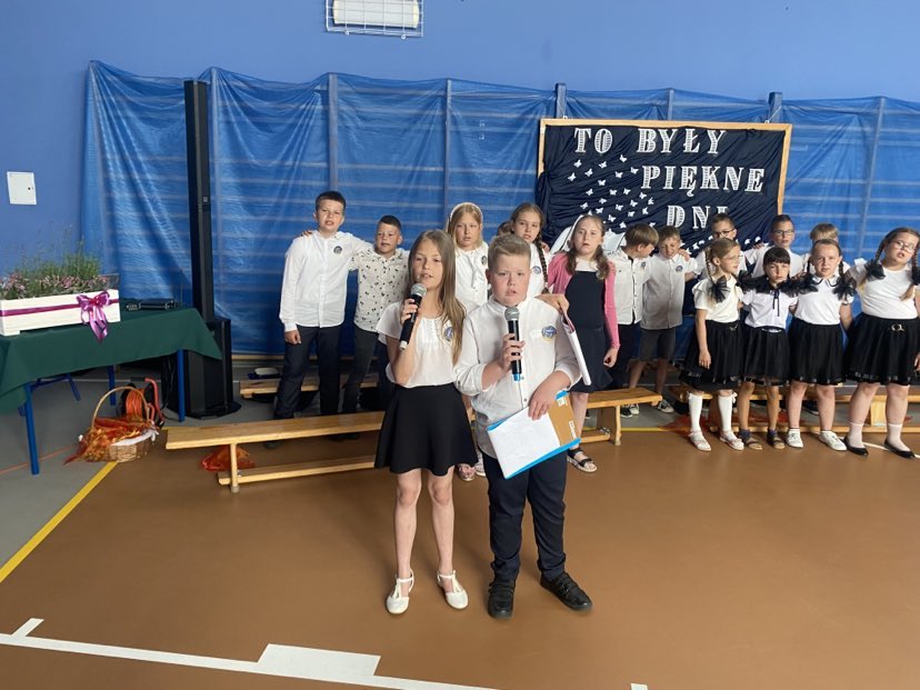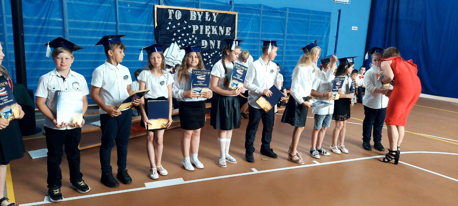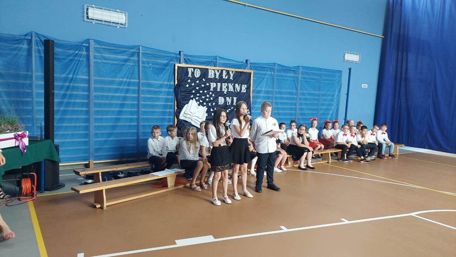 23 czerwca zakończyliśmy kolejny rok szkolny. Tego dnia pożegnaliśmy klasę III, która od września przenosi się do Szkoły w Racocie. Uczniowie otrzymali dyplomy ukończenia klasy III z rąk pana Dyrektora. Uroczystość została pięknie przygotowana przez każdą z klas. Klasa II drobnym upominkiem i tańcem pożegnała naszych absolwentów. Były kwiaty, uściski i piosenki, które doprowadziły do wielu wzruszeń. Klasa III pożegnała wszystkich krótkimi rymowankami, które na długi czas pozostaną nam w pamięci.