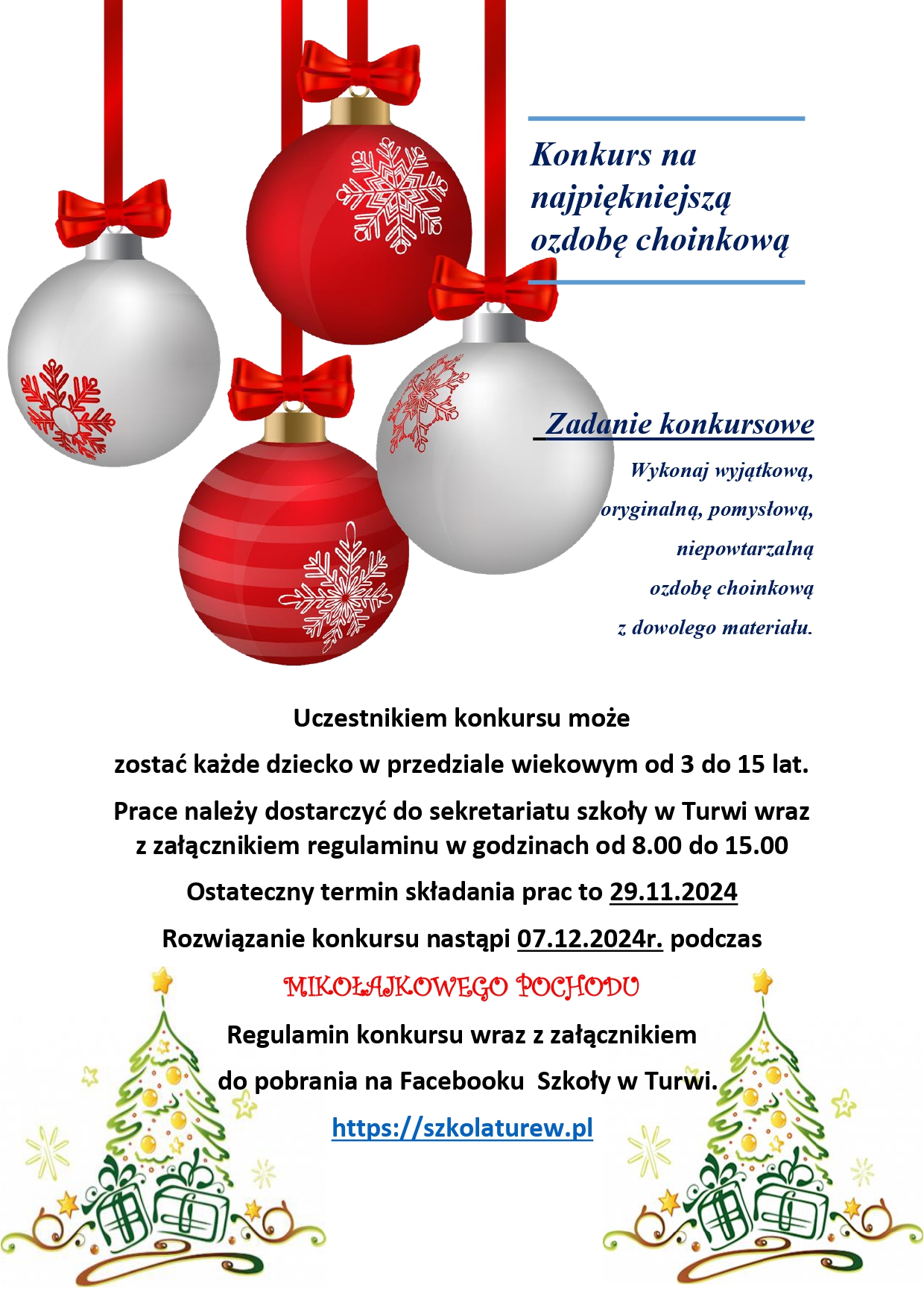6 listopada 2024 Filip Michałkowski Konkurs na najpiękniejszą ozdobę choinkową REGULAMIN KONKURSU NA OZDOBĘ CHOINKOWĄPobierz Udostępnij:Udostępnij Udostępnij w serwisie Facebook (Otwiera się w nowym oknie) Facebook Udostępnij na WhatsApp (Otwiera się w nowym oknie) WhatsApp Udostępnij na X (Otwiera się w nowym oknie) X Lubię Wczytywanie… Powiązane